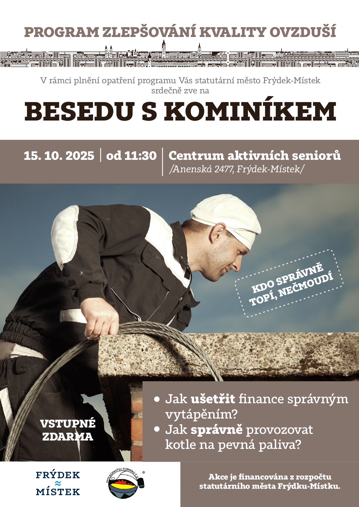 V rámci besedy bude možné si popovídat s předsedou Společenstva kominíků Severní Moravy a Slezska, Mgr. Tomášem Kočičkou, a to na témata dotýkající se např. správného provozu kotlů na pevná paliva či jak lze správným vytápěním ušetřit finance. Vstup na akci je zdarma.