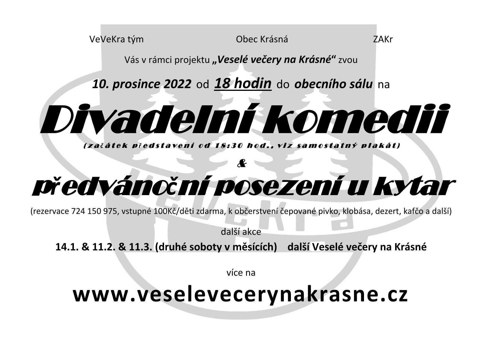 VeVeKra tým, Obec Krásná a ZAKr Vás v rámci projektu „Veselé večery na Krásné“ zvou do obecního sálu na Divadelní komedie a předvánoční posezení u kytary. Divadlo Klauniky uvádí POHÁDKY V HANTECU II. Ty nejznámější pohádky, jak se neznáte. Určeno pro dospělé.