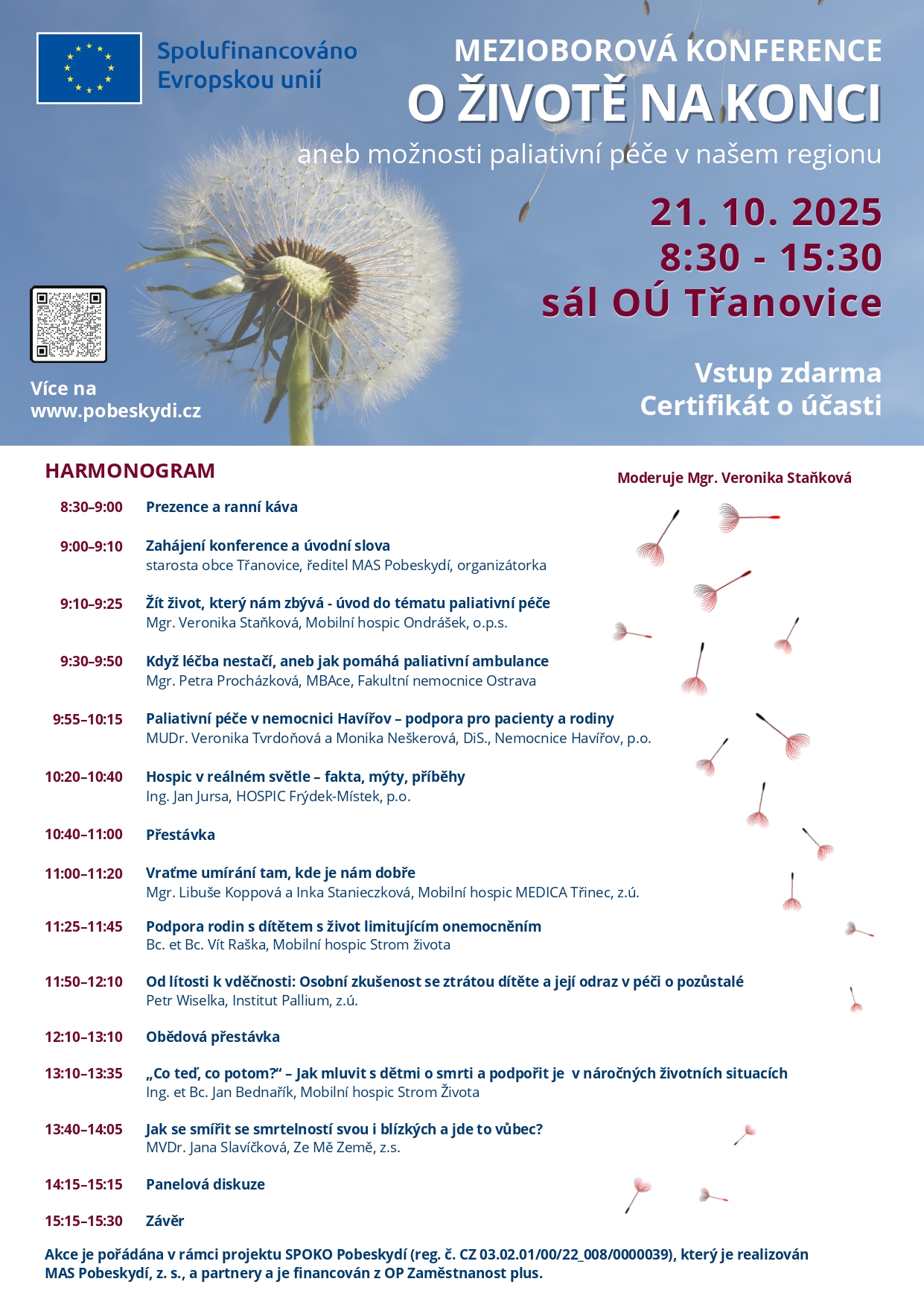 MAS Pobeskydí Vás zve na mezioborovou konferenci o možnostech paliativní péče v našem regionu. Konference je určena jak pro odborné pracovníky, tak i pro pečující a širokou veřejnost. Podrobný program najdete níže.