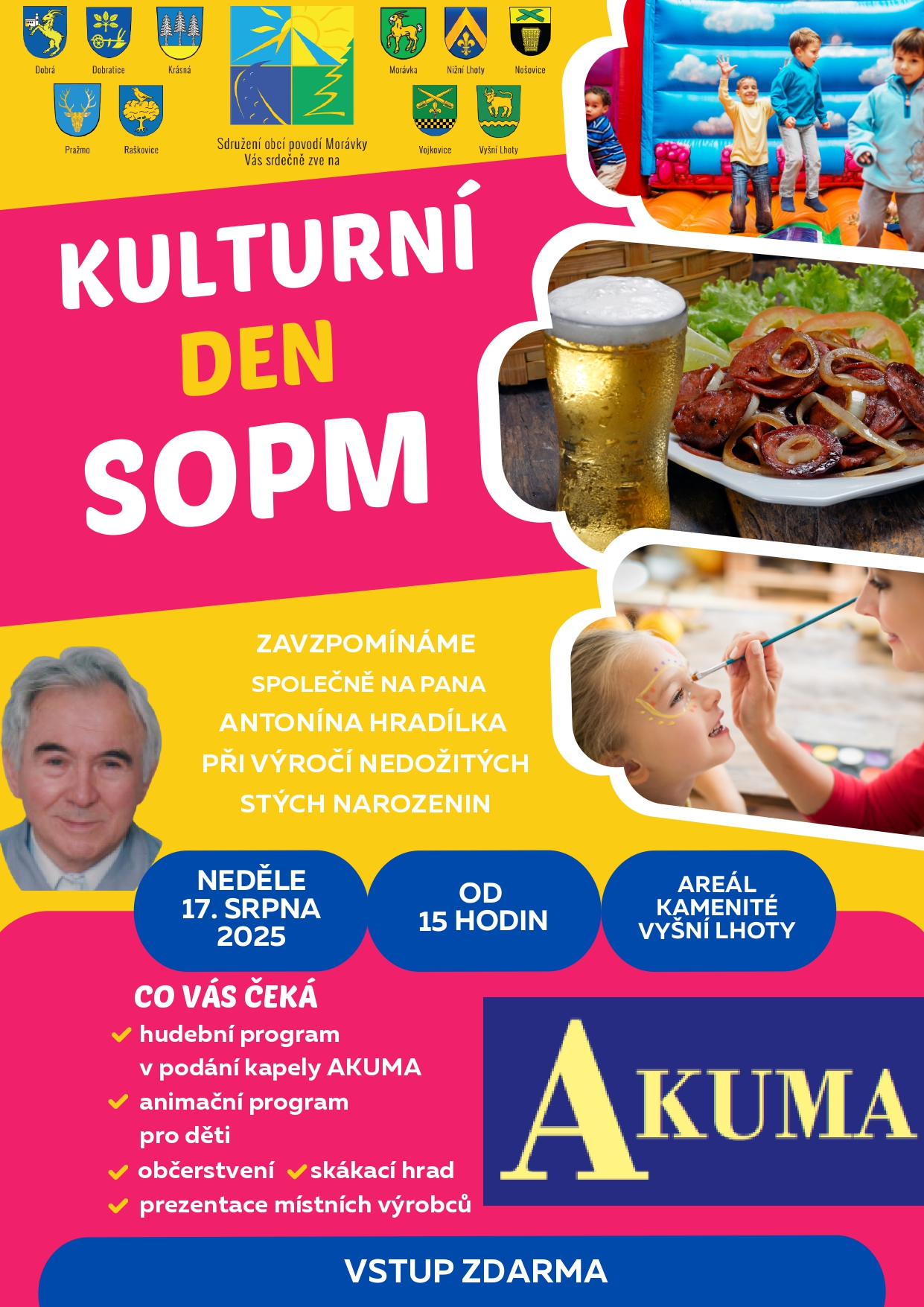 Srdečně vás zveme na Kulturní den SOPM, který se uskuteční v neděli 17. srpna 2025 od 15:00 v areálu Kamenité ve Vyšních Lhotách. Čeká vás bohatý program pro celou rodinu – hudební vystoupení kapely AKUMA, animační programy pro děti, skákací hrad, občerstvení a prezentace místních výrobců. Během akce společně zavzpomínáme na pana Antonína Hradílka u příležitosti výročí jeho nedožitých 100. narozenin. Přijďte si užít příjemné odpoledne plné zábavy, hudby a dobré nálady. Vstup je zdarma!