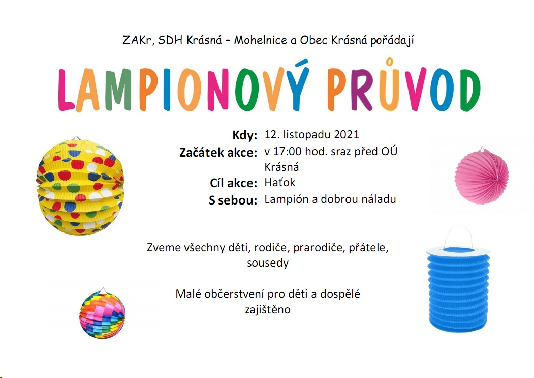 ZAKr, SDH Krásná – Mohelnice a Obec Krásná pořádají LAMPIÓNOVÝ PRŮVOD. Zveme všechny děti, rodiče, prarodiče, přátele, sousedy.