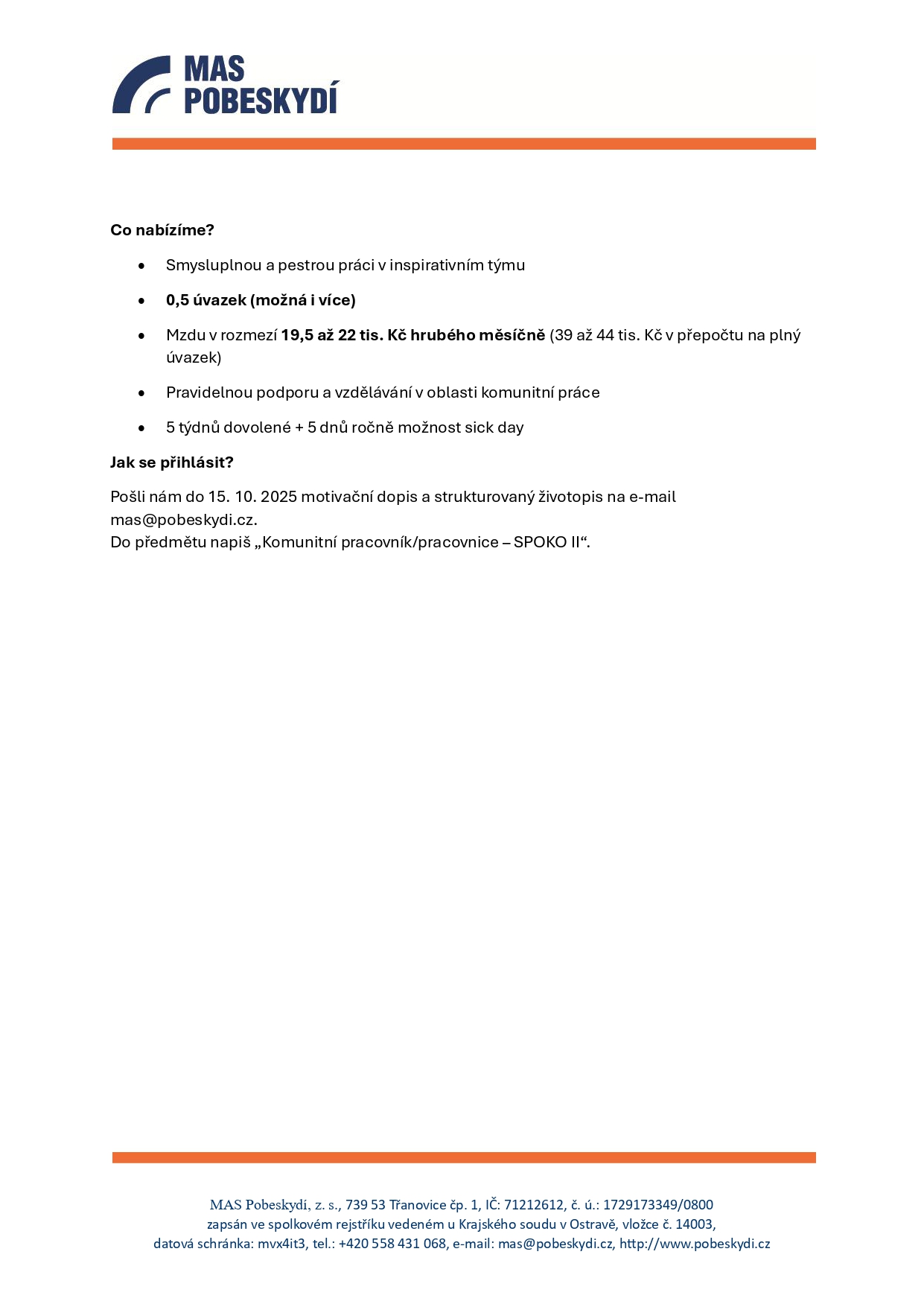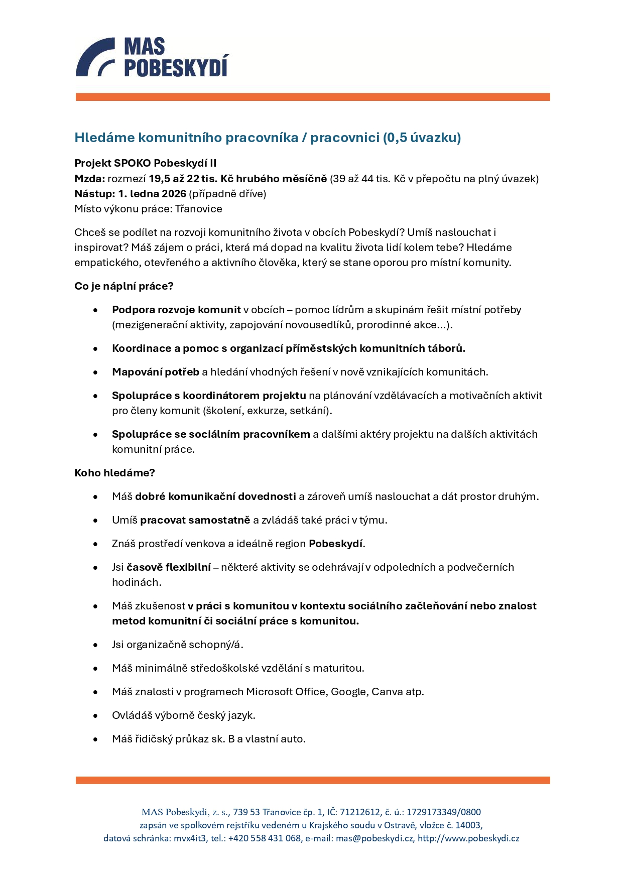 Pokud byste o tuto pracovní pozici měli zájem, zašlete svůj životopis a motivační dopis do 15. října 2025 na e-mail mas@pobeskydi.cz.