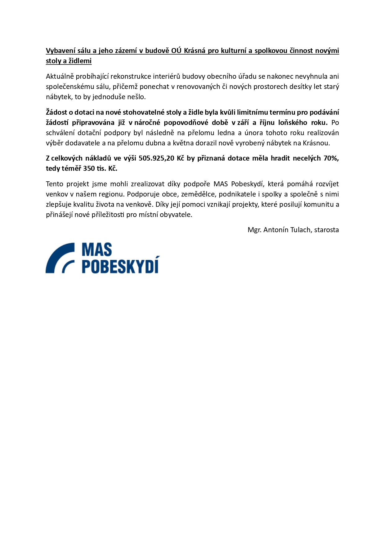 MAS Pobeskydí podpořila vybavení sálu a jeho zázemí v budově OÚ Krásná pro kulturní a spolkovou činnost novými stoly a židlemi: