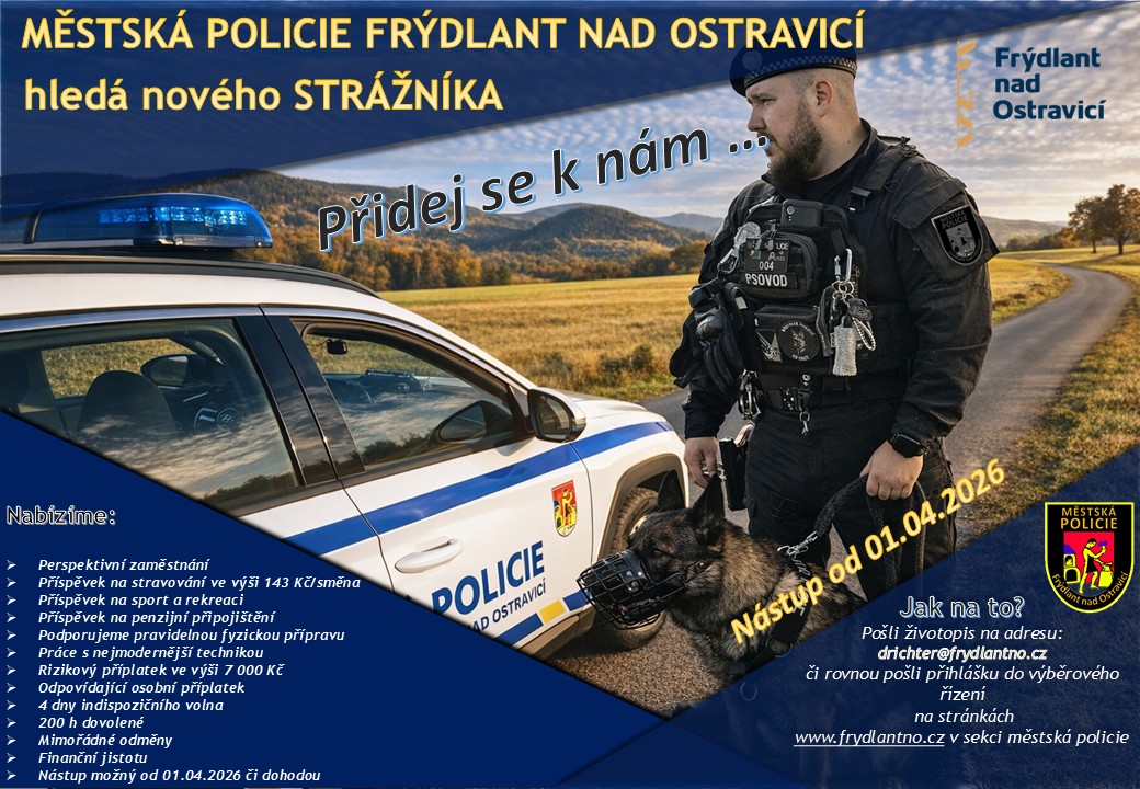 Městská policie Frýdlant nad Ostravicí hledá do svých řad nového strážníka. Nástup již od 01.04.2026! Životopisy posílejte na drichter@frydlantno.cz či rovnou podejte přihlášku do výběrového řízení na www.frydlantno.cz v sekci městská policie.