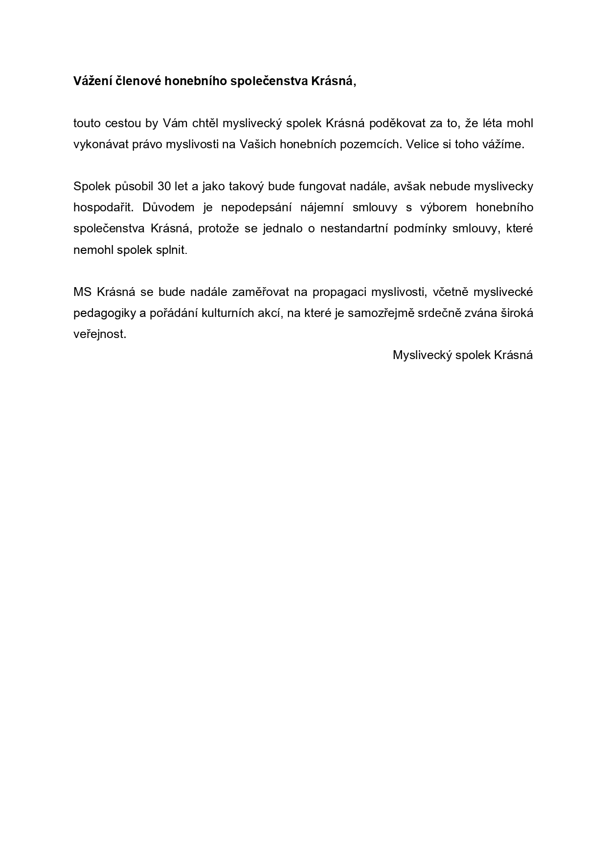 Myslivecký spolek Krásná děkuje honebnímu společenstvu Krásná za mnoholetou spolupráci.