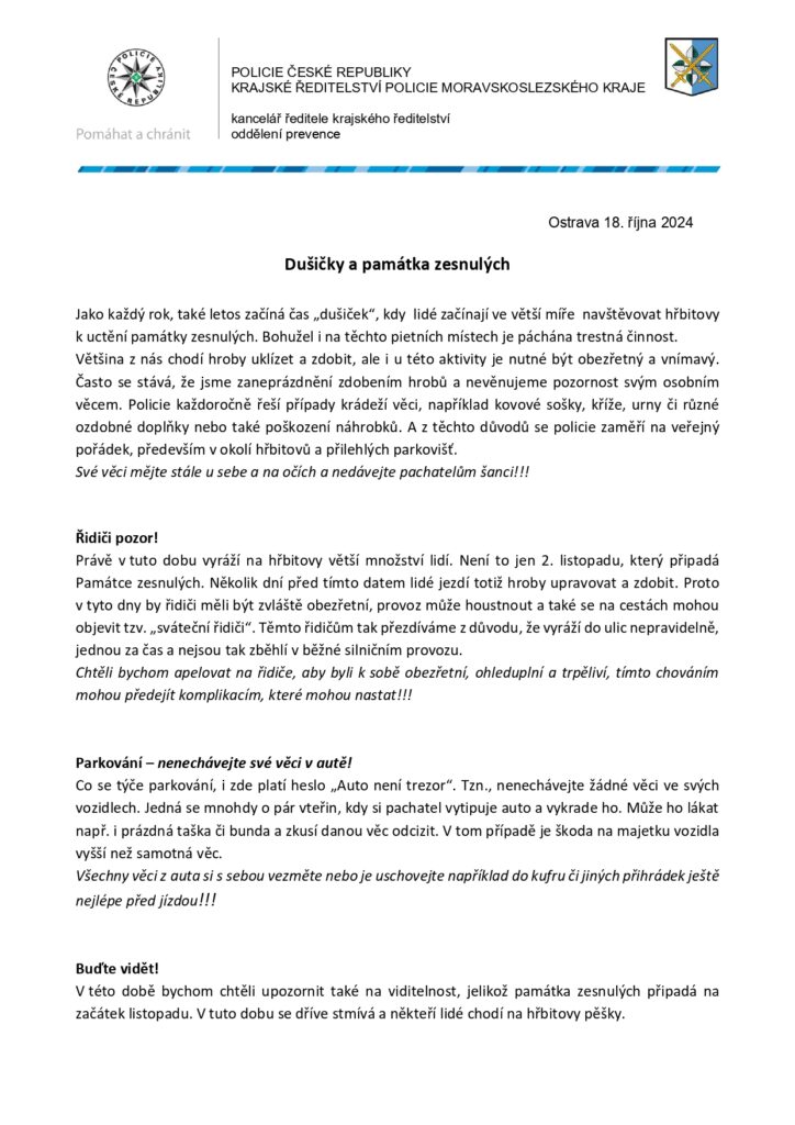 Zpět na Památka zesnulých – Policie ČR nabádá k ostražitosti