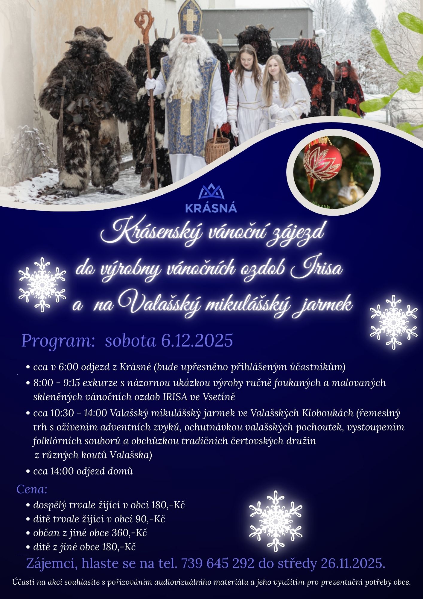 Obec Krásná vás srdečně zve na předvánoční zájezd. Tentokrát se podíváme do výrobny vánočních ozdob Irisa ve Vsetíně a poté navštívíme Valašský mikulášský jarmek ve Valašských Kloboukách. Vydejte se s námi za vánoční náladou!