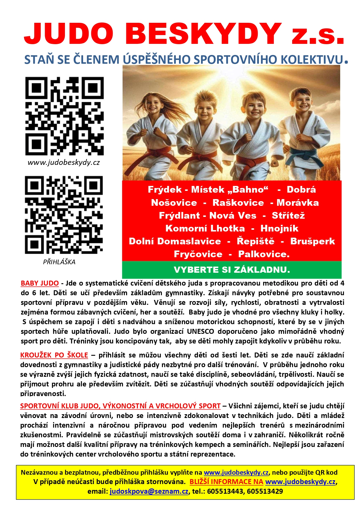 Judo Beskydy nabízí tréninky pro děti všech věkových i výkonnostních kategorií. Podrobnosti najdete v přiloženém letáčku.