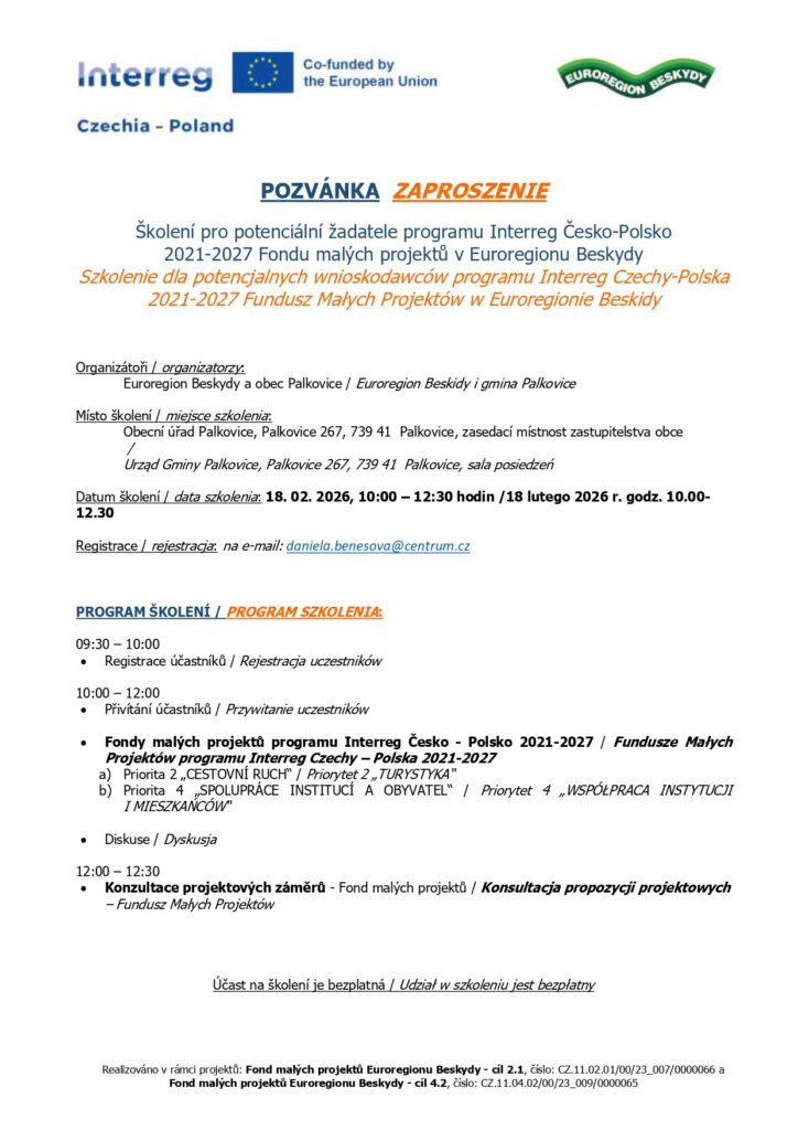 Zpět na Školení pro potenciální žadatele programu Interreg Česko-Polsko 2021-2027 Fondu malých projektů v Euroregionu Beskydy