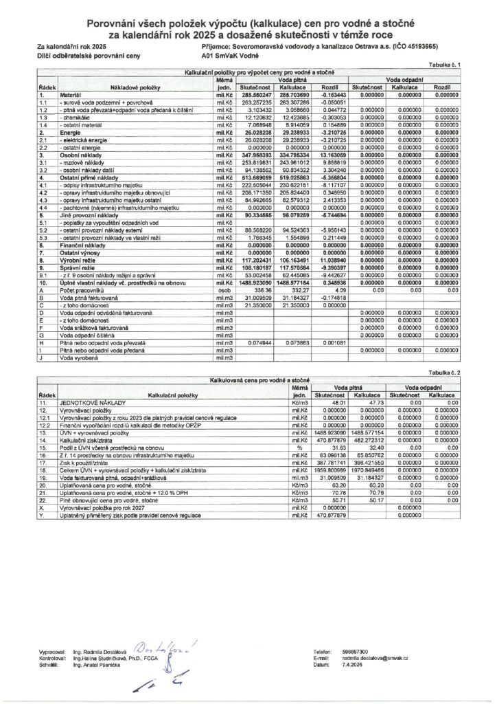 Zpět na SmVaK – Porovnání všech položek výpočtu ceny pro vodné a stočné za kalendářní rok 2025 a dosažené skutečnosti v témže roce