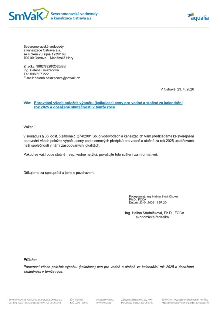 Zpět na SmVaK – Porovnání všech položek výpočtu ceny pro vodné a stočné za kalendářní rok 2025 a dosažené skutečnosti v témže roce Od Obecní úřad Krásná Publikováno 2026-04-28 Původní velikost je 1241 × 1754 pixelů