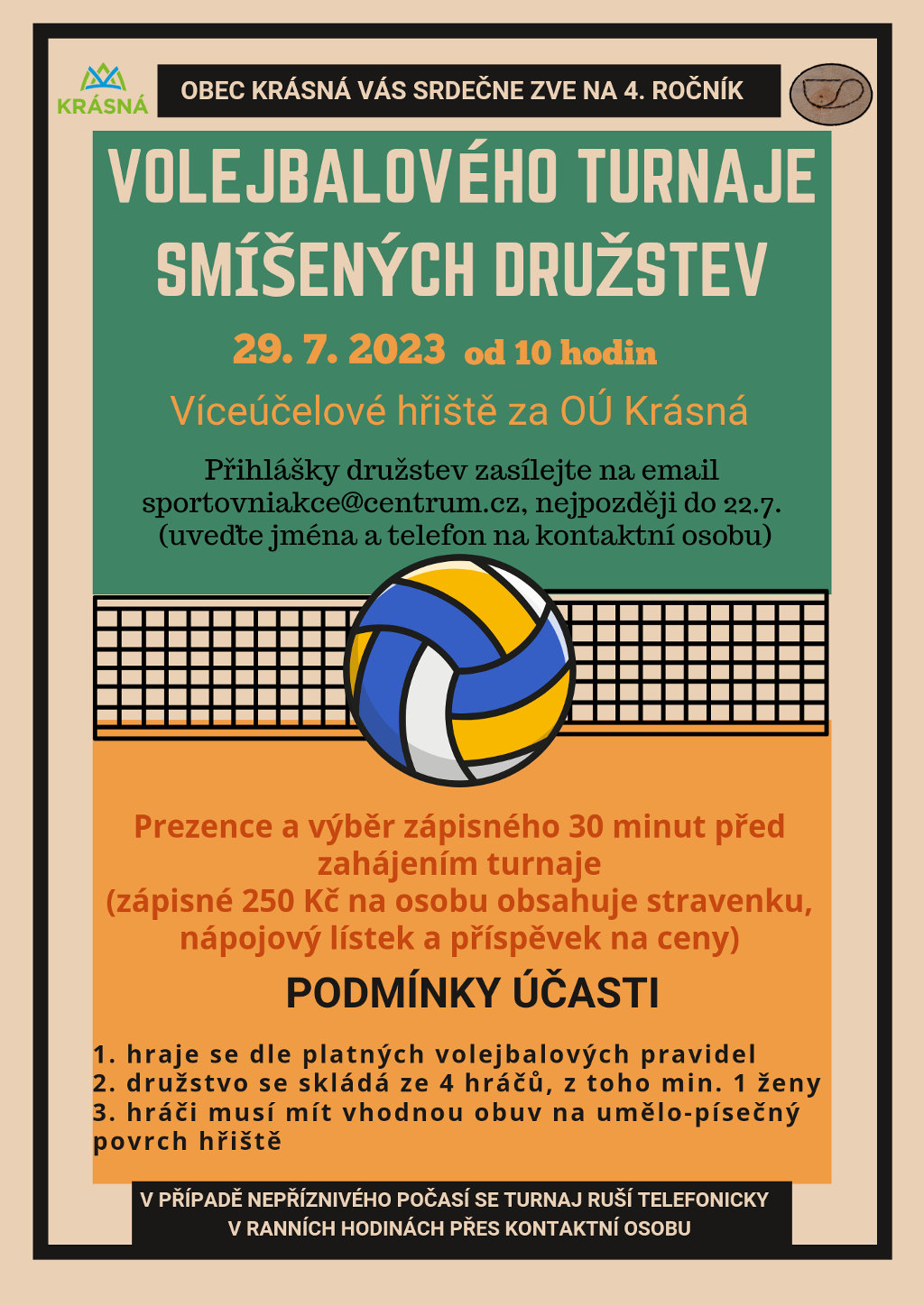 Obec Krásná Vás srdečně zve na 4. ročník volejbalového turnaje smíšených družstev.