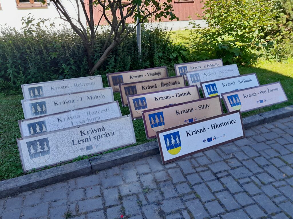 Od jara loňského roku došlo k postupné obnově označovacích desek s názvy našich autobusových zastávek, bočních údolí a dalších míst v obci. Vytvořila je pro nás Tiskárna Kleinwächter a instalovali je naši šikovní hoši z technické čety.  Pro nevyhovující stav byla nutná i oprava velkých vítacích a loučících tabulí na Mohelnici i Dolní Krásné. Grafický návrh desek i tabulí vycházel z nového obecního loga naší obce a jeho barev.