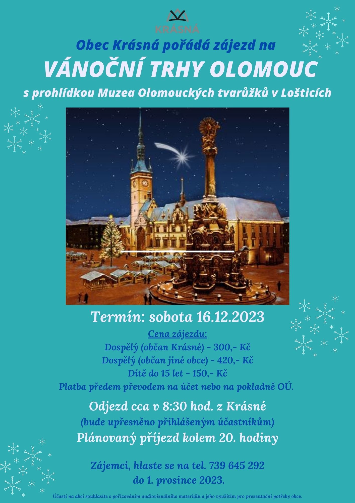 Srdečně Vás zveme na tradiční obecní zájezd! Tentokrát se můžete těšit na prohlídku Muzea Olomouckých tvarůžků v Lošticích a poté navštívíme Vánoční trhy v Olomouci.