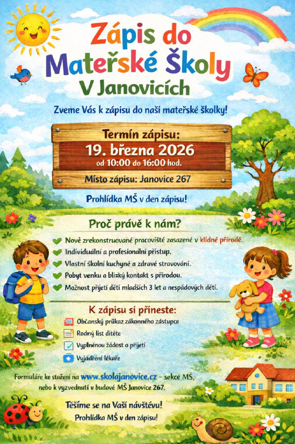 MŠ Janovice od podzimu 2026 otevírá nové oddělení mateřské školy v budově na Bystrém a bude mít prostor i pro nespádové děti. Pokud máte zájem o umístění vašeho dítka v tomto zařízení, můžete přijít na zápis, který proběhne ve čtvrtek 19. března 2026 v kmenové školce v Janovicích (č. p. 267).