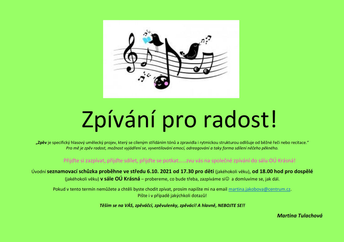 Přijďte si zazpívat, přijďte sdílet, přijďte se potkat……zvu vás na společné zpívání do sálu OÚ Krásná!