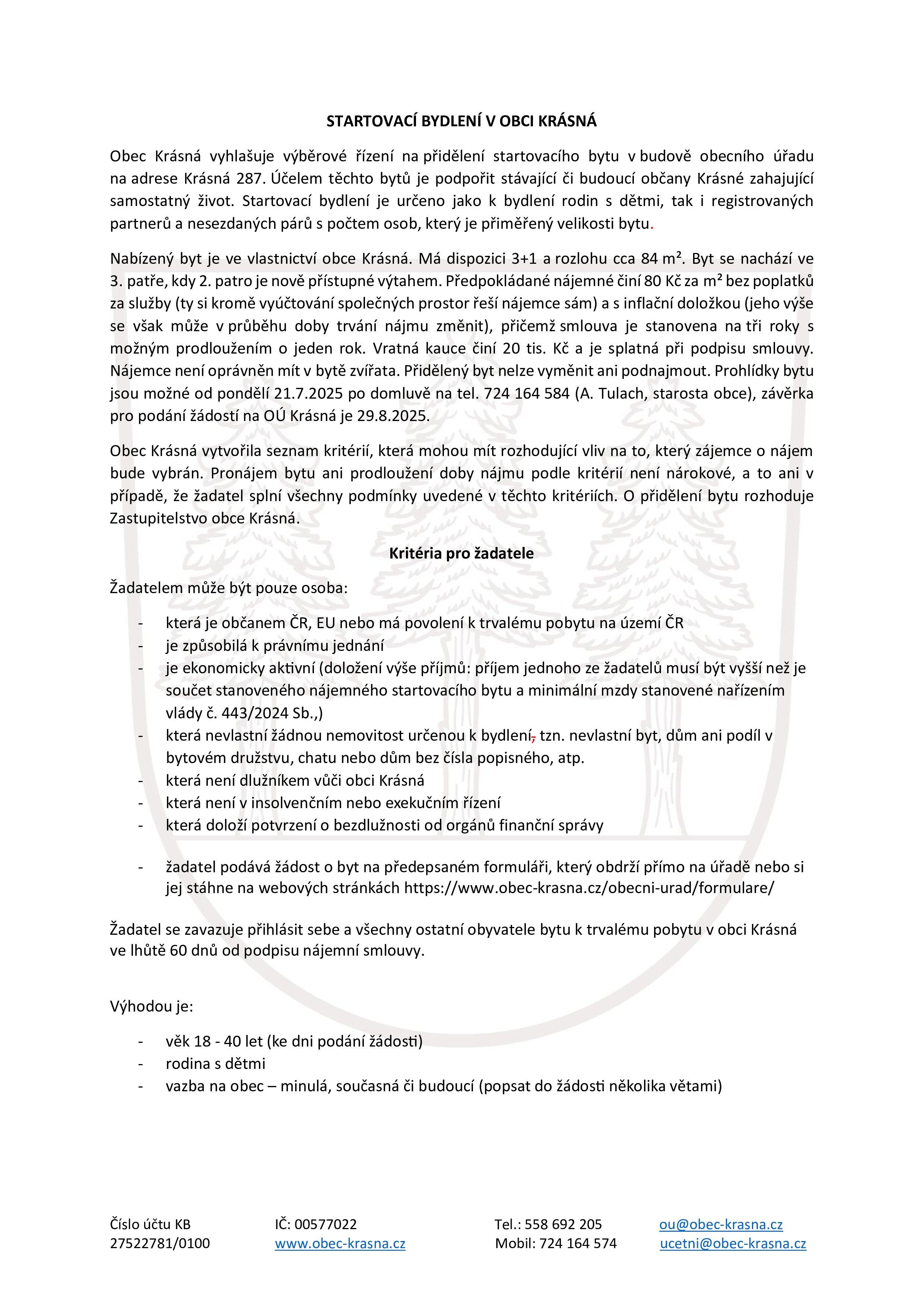 ještě stále máte možnost podat přihlášku na startovací nájemní bydlení v naší obci. Přihlášku je možné podat do pátku 29.8.2025. Více informací naleznete v přiloženém letáčku.