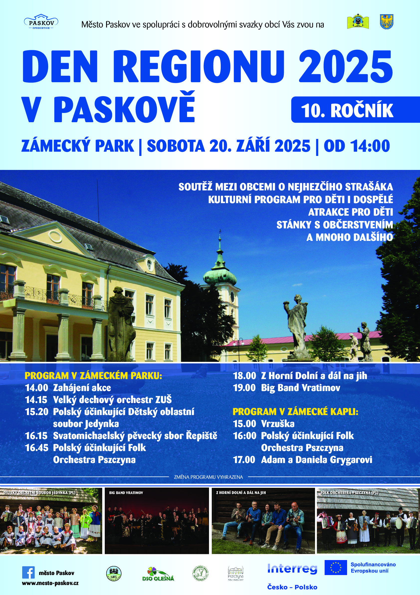 V sobotu 20. září 2025 od 14:00 hodin se v zámeckém parku v Paskově uskuteční tradiční Den regionu. Desátý ročník přinese zajímavý program jak v parku, tak v zámecké kapli. Čekají vás i soutěže mezi obcemi, pro děti budou připraveny zábavné atrakce. Kromě kulturního vyžití nebude chybět ani pestrá nabídka stánků s občerstvením.