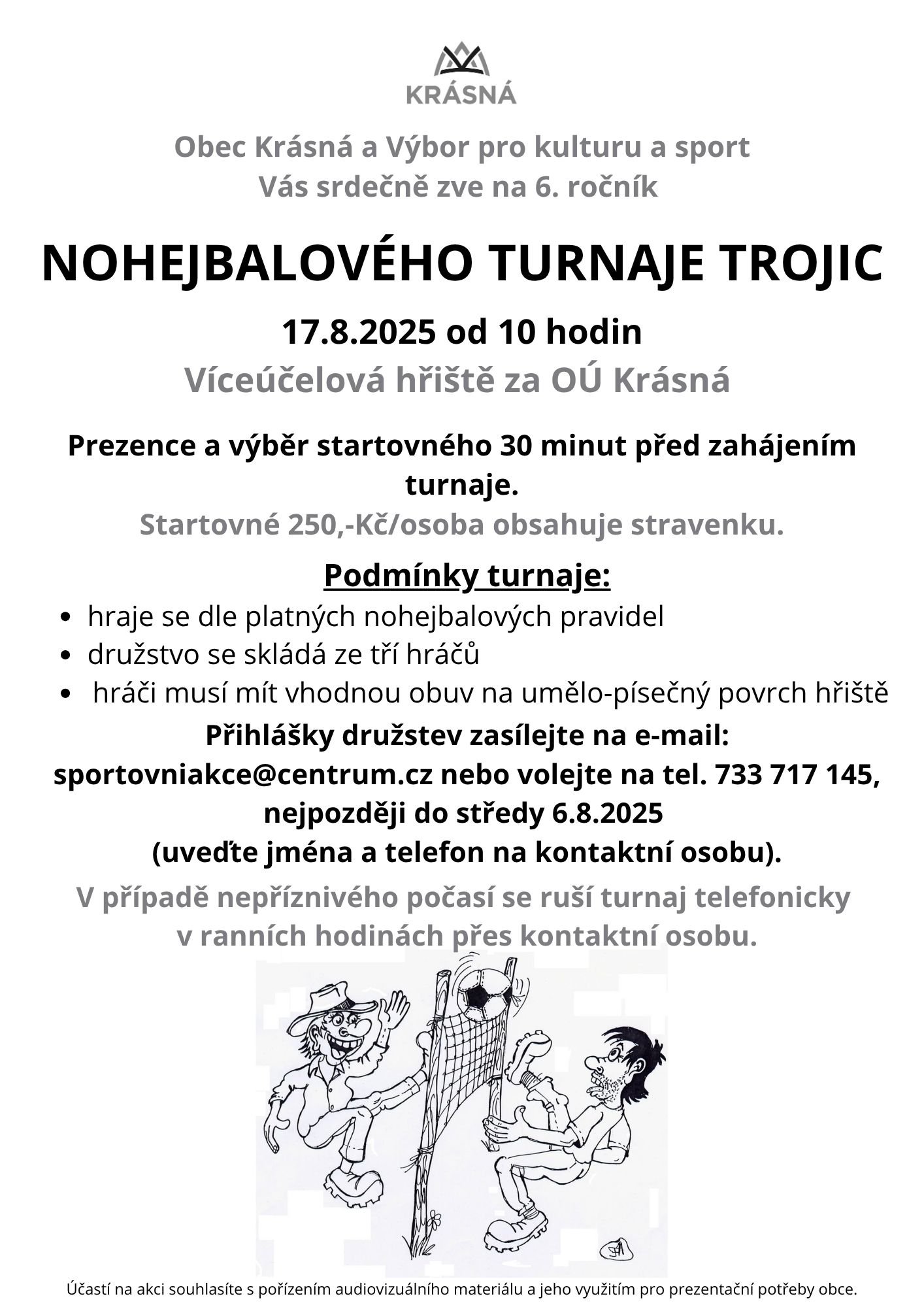 Obec Krásná a Výbor pro kulturu a sport Vás srdečně zve na 6. ročník Nohejbalového turnaje trojic. Akce se koná v neděli 17.8.2025 od 10 hodin na víceúčelových hřištích za OÚ Krásná. Přihlásit své družstvo můžete do 6.8.2025. Přijďte si s námi užít skvělou sportovní atmosféru!