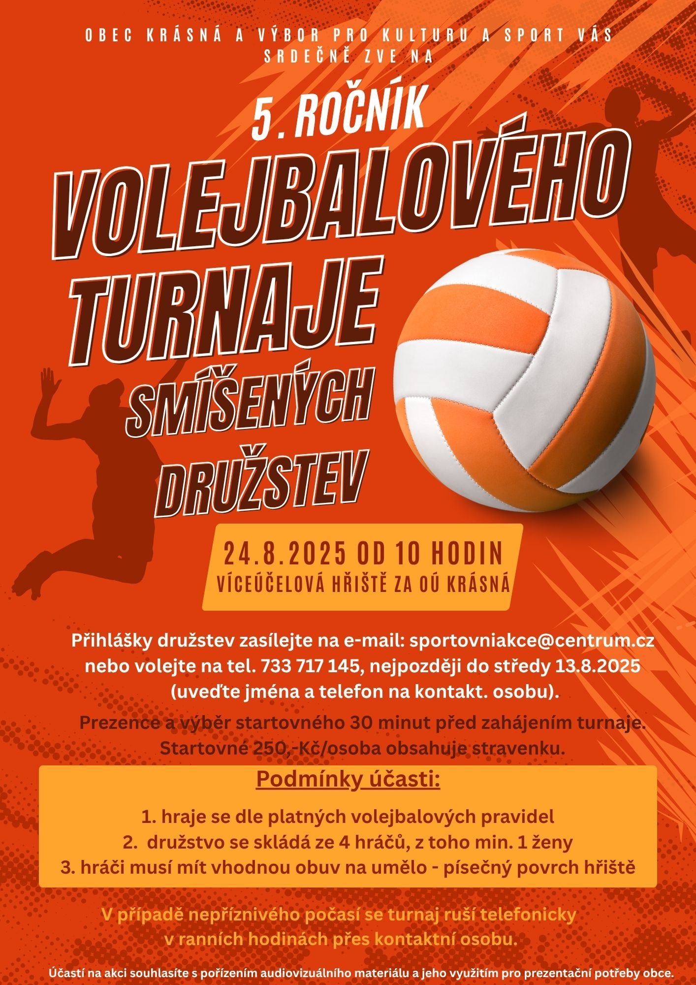 Srdečně vás zveme na 5. ročník Volejbalového turnaje smíšených družstev, který pořádá obec Krásná a Výbor pro kulturu a sport. Akce se bude konat v neděli 24. srpna 2025 od 10:00 na víceúčelových hřištích za OÚ Krásná. Přihlášky přijímáme do 13. srpna 2025. Nezapomeňte se přihlásit a přijďte si užít skvělý sportovní den!