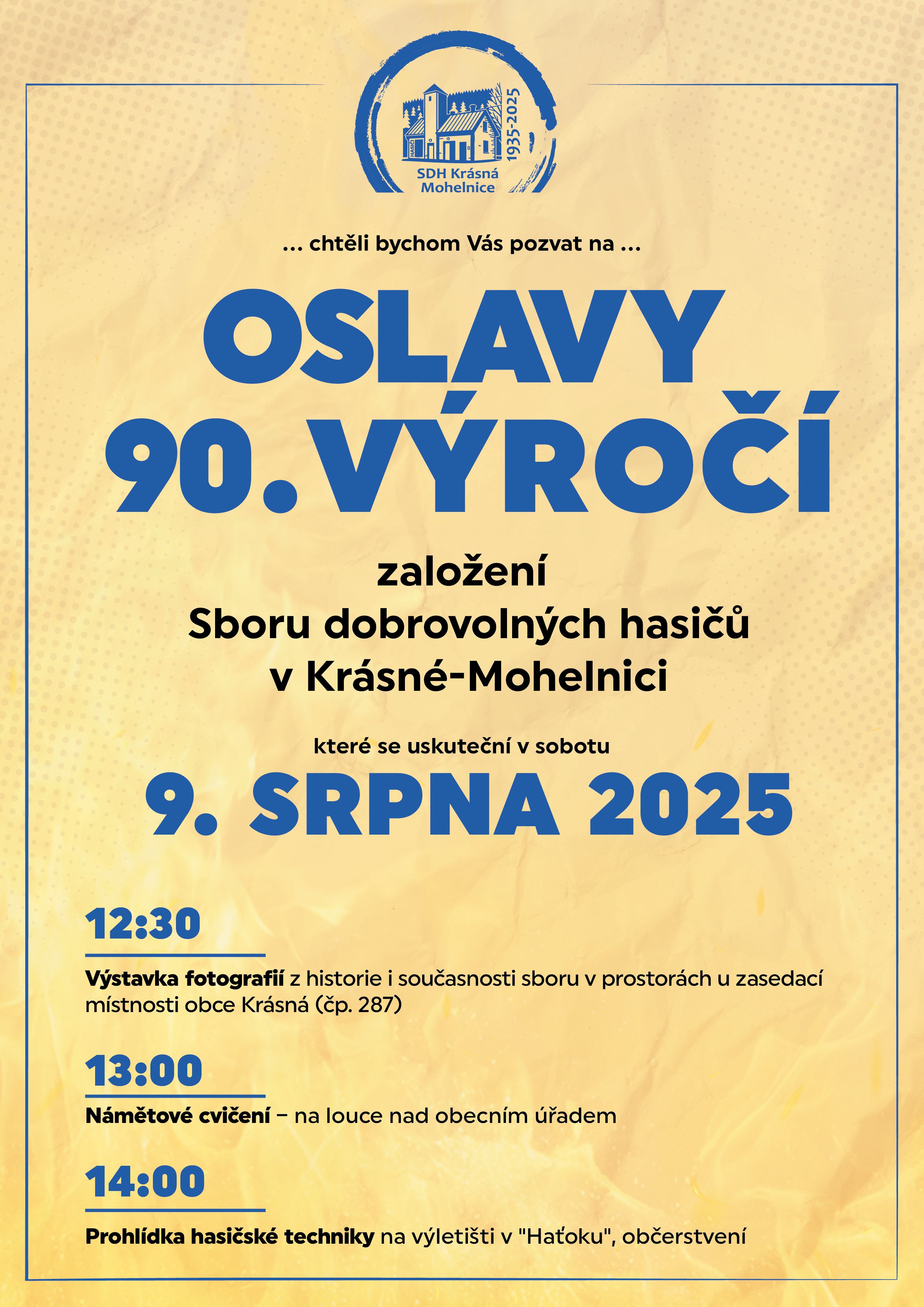 Všichni příznivci hasičů jsou srdečně zváni na oslavy 90. výročí založení SDH Krásná-Mohelnice, které se uskuteční již tuto sobotu 9. srpna 2025 od 12:30. Na programu je výstava fotografií z historie i současnosti sboru, námětové cvičení a poté prohlídka hasičské techniky. Pro děti bude na výletišti Haťok připraveno oblíbené dovádění v pěně.