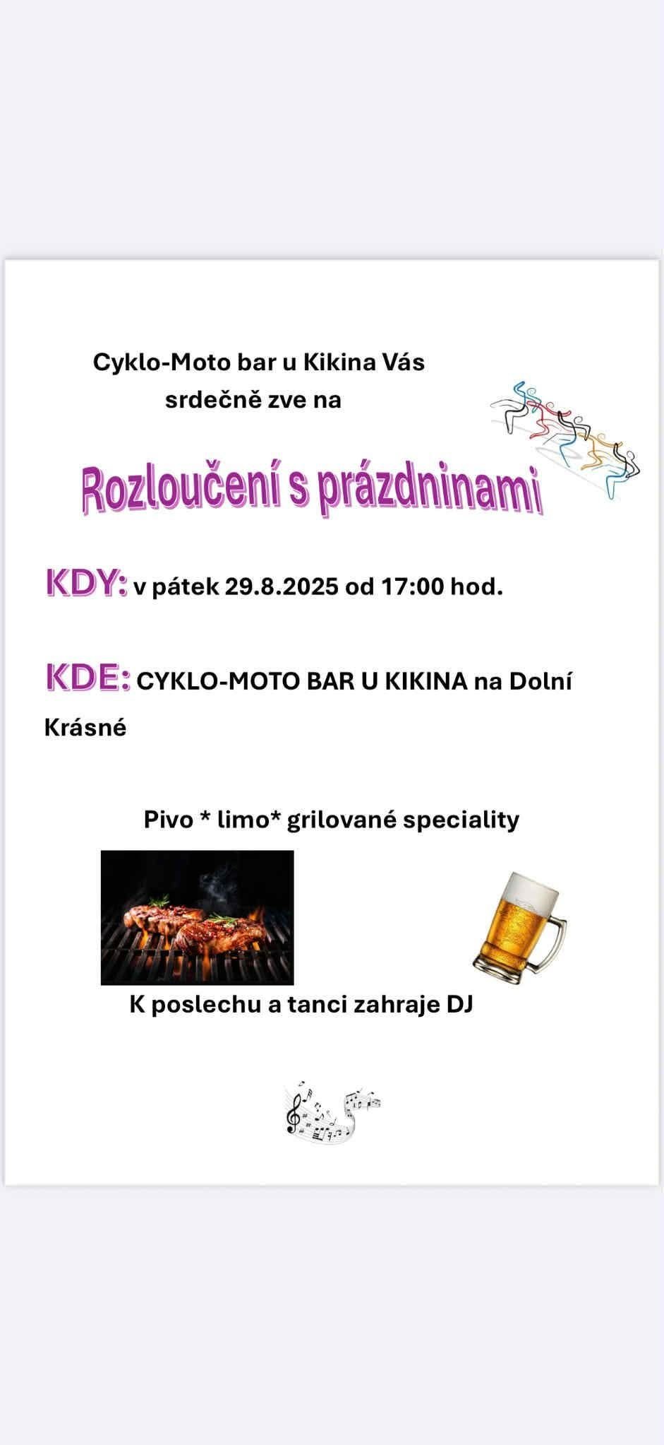 Již tento pátek 29.8.2025 proběhne v Cyklo-Moto Baru U Kikina na Dolní Krásné rozloučení s prázdninami. Akce začíná v 17:00. Jste srdečně zváni!