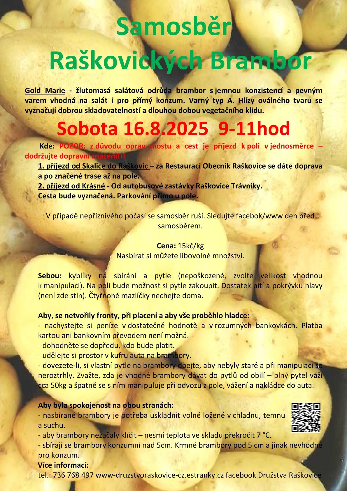 Družstvo Raškovice pořádá dne 16.8.2025 od 9-11 hodin samosběr brambor. Více informací naleznete v přiloženém letáčku.