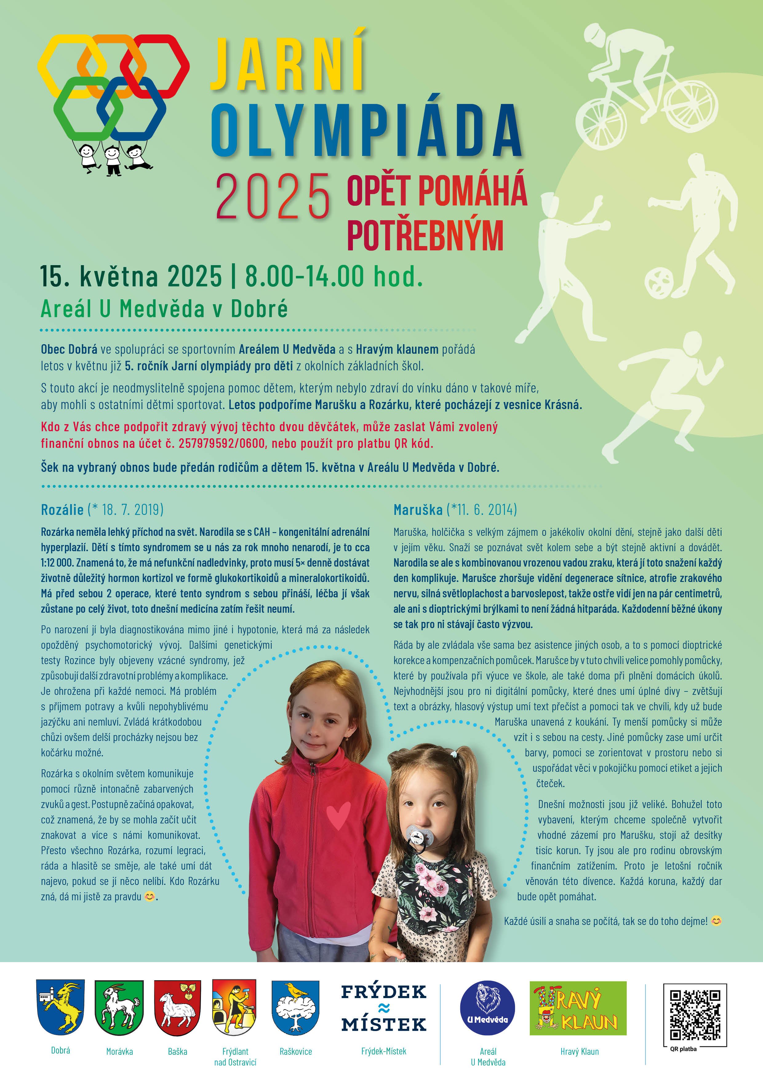 připomínáme možnost přispět na dobrou věc – léčbu a zdravotní pomůcky pro Marušku a Rozárku, dvě zdravotně znevýhodněné holčičky z naší obce. Pomoci můžete zasláním Vámi zvolené částky na č. účtu 257979592/0600.