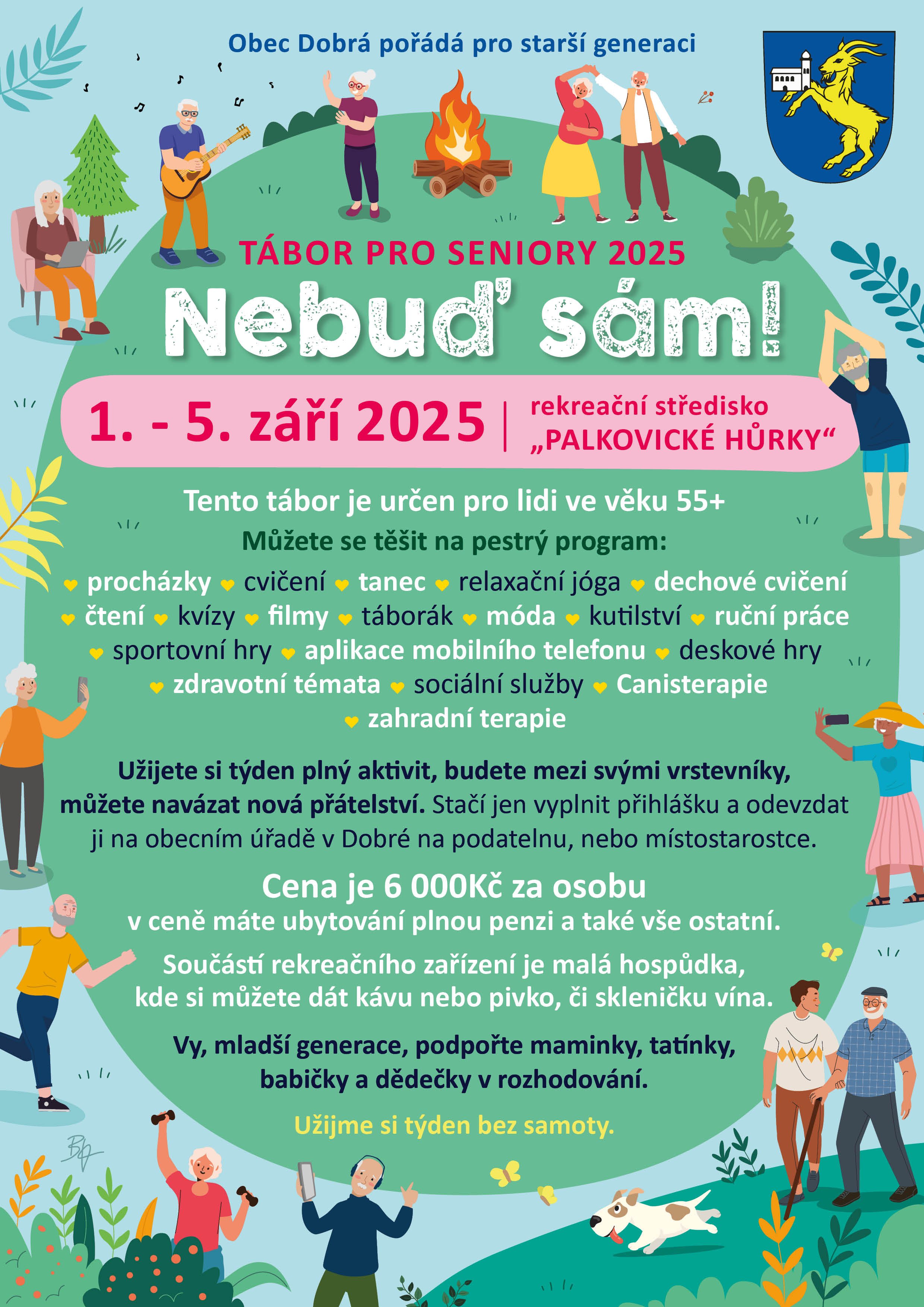 Obec Dobrá pořádá od 1. do 5. září 2025 v rekreačním středisku Palkovické hůrky tábor pro starší generaci. Užijete si týden plný aktivit mezi svými vrstevníky, navážete nová přátelství!