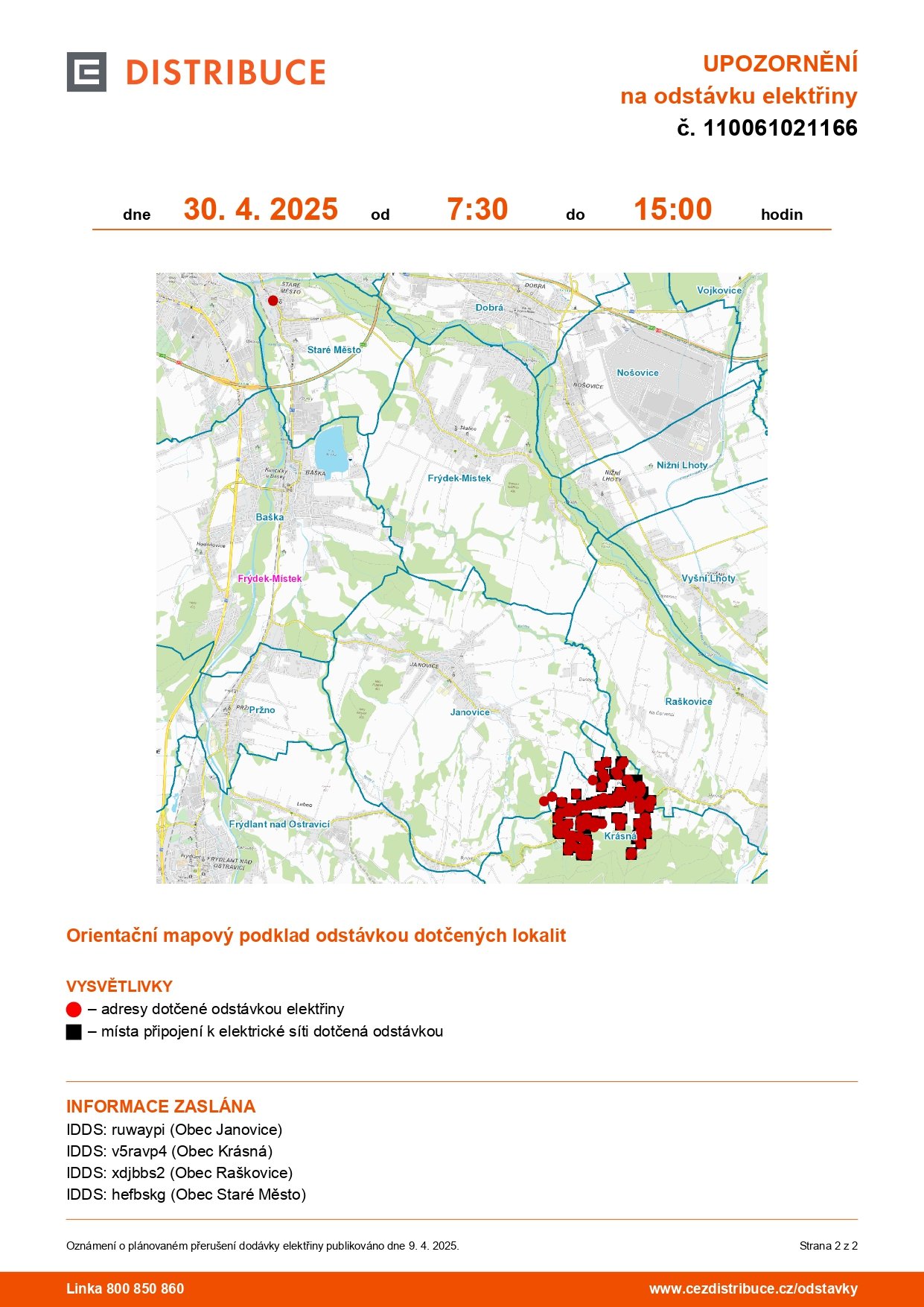 dovolujeme si Vás upozornit na odstávku elektřiny, která proběhne v části obce Krásná ve středu 30.4.2025, a to od 7:30 do 15:00.