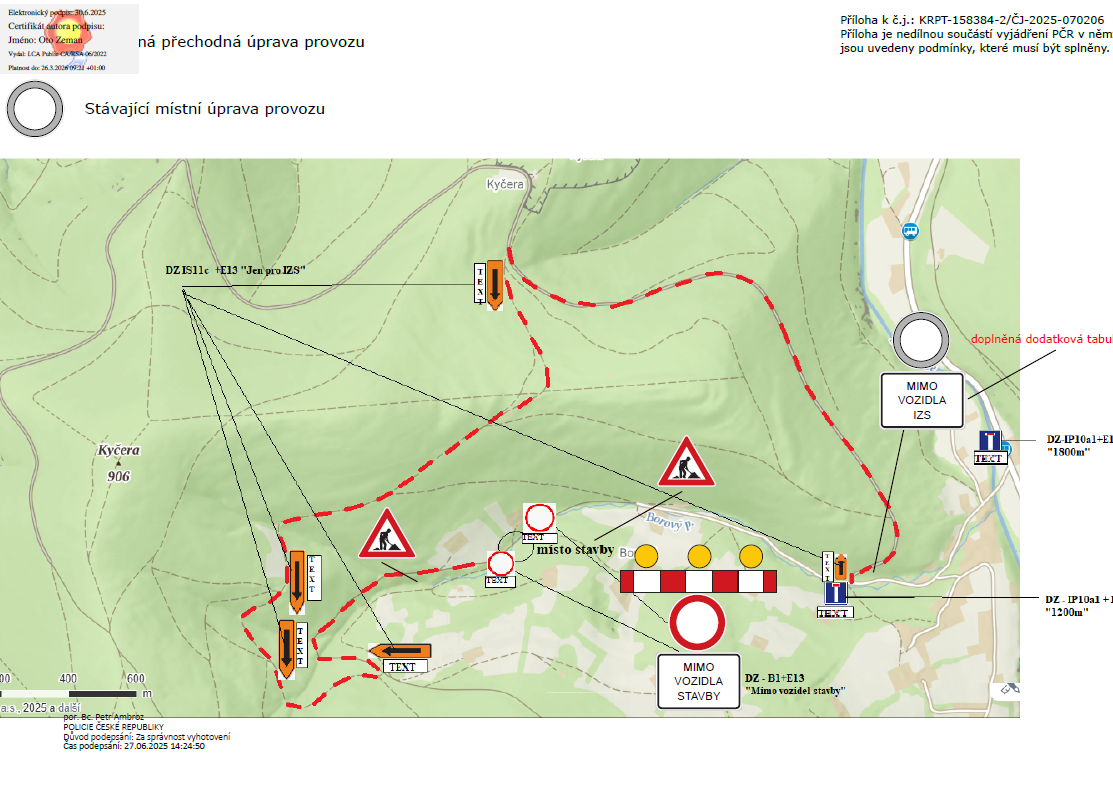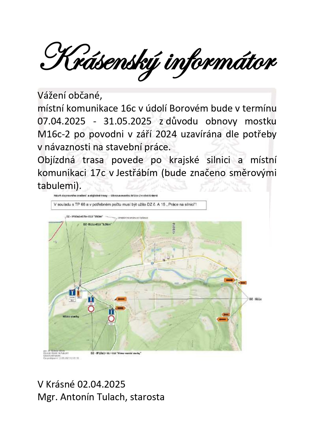 od 07.04.2025 do 31.05.2025 bude cesta do Borového v místě obnovovaného mostku M16c-2 (viz příloha) dle potřeby v návaznosti na stavební práce uzavírána. Objízdná trasa povede přes Jestřábí.
