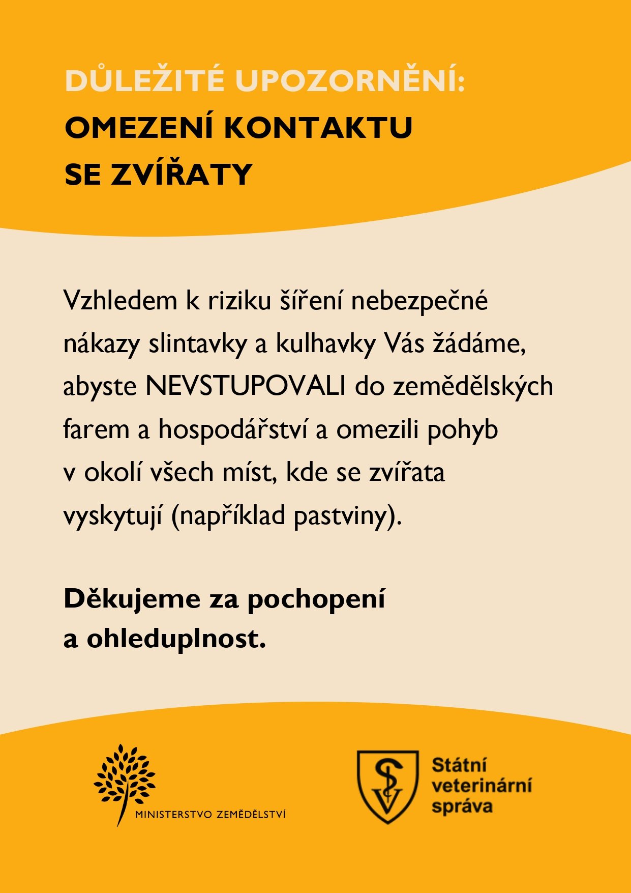 vzhledem k riziku šíření nebezpečné nákazy slintavky a kulhavky Vás žádáme,abyste NEVSTUPOVALI do zemědělských farem a hospodářství a omezili pohybv okolí všech míst, kde se zvířata vyskytují (například pastviny).