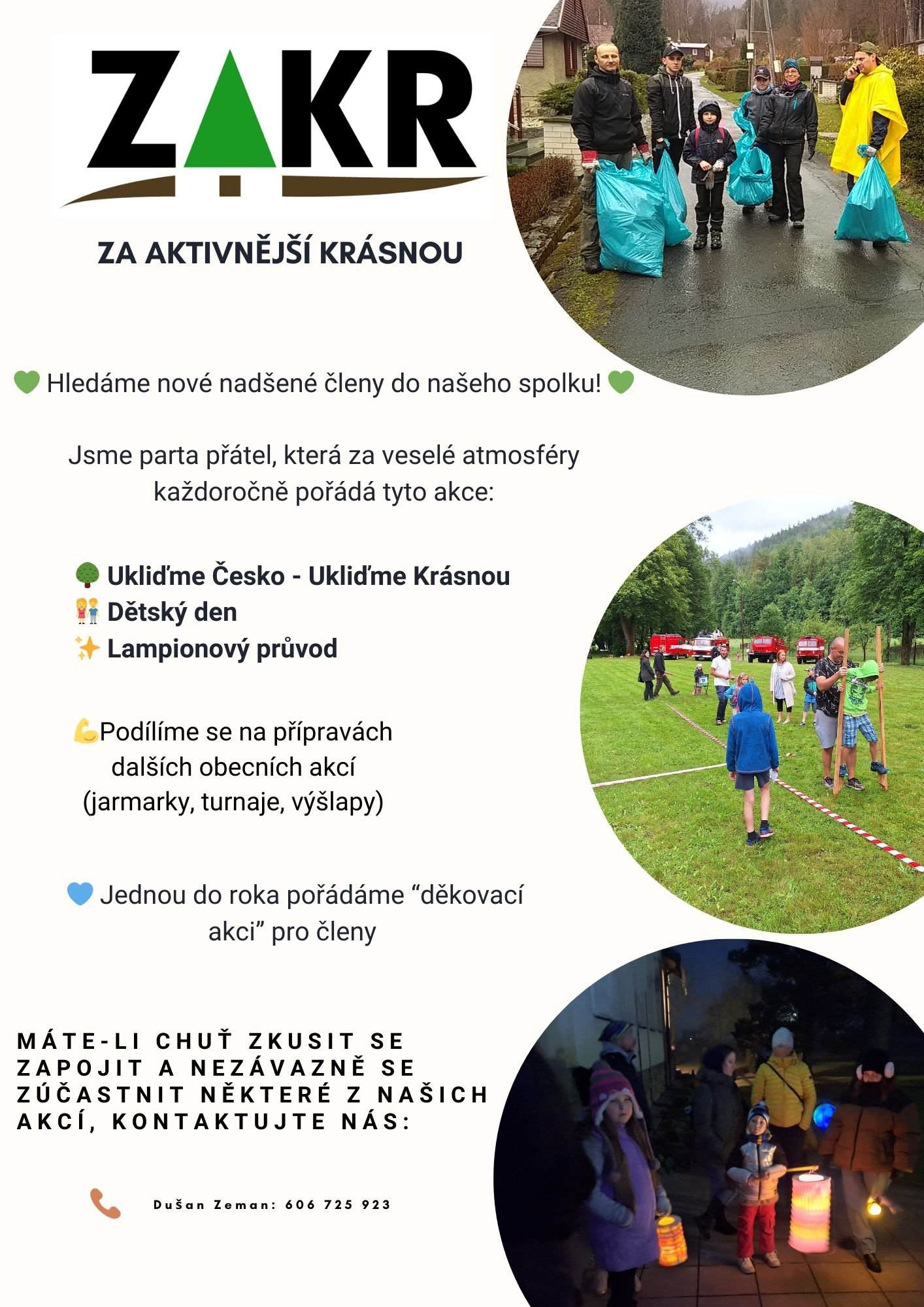 Spolek ZAKr – Za aktivnější Krásnou hledá nové členy. Máte-li chuť zapojit se do organizace akcí jako Ukliďme Česko, dětský den, lampionový průvod či se podílet na přípravách dalších obecních akcí, kontaktujte pana Dušana Zemana na tel. 606 725 923.