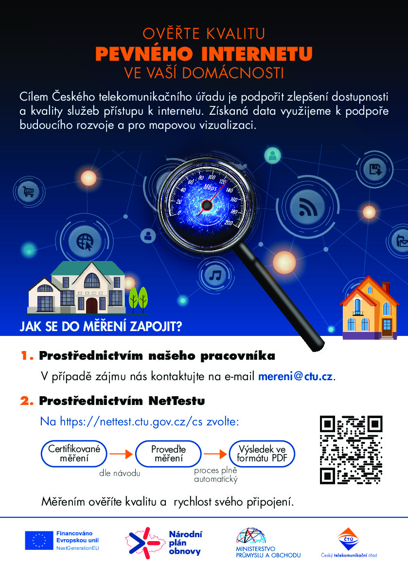 níže naleznete informace o možnosti ověřit si kvalitu a rychlost Vašeho pevného internetového připojení. Do měření se můžete zapojit prostřednictvím pracovníka Českého telekomunikačního úřadu (kontakní e-mail: mereni@ctu.cz) nebo na webových stránkách. Výsledky měření budou mimo jiné využity ke zlepšení dostupnosti a kvality služeb v jednotlivých regionech.