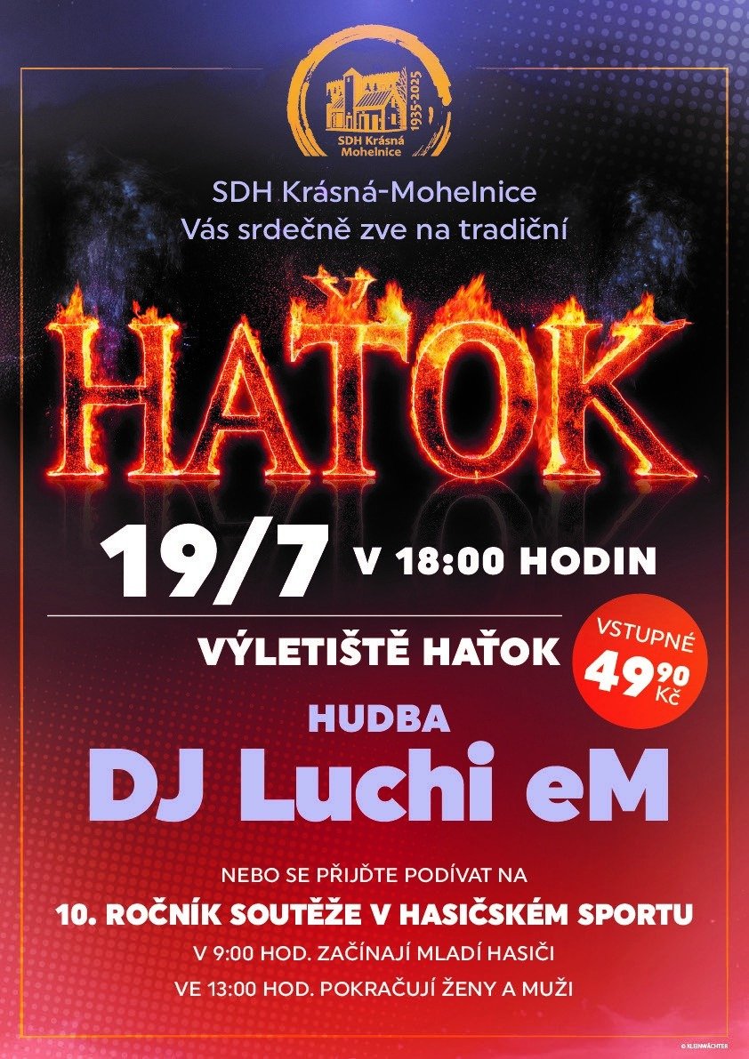 Už toto sobotu na vás čeká oblíbená letní zábava Haťok! Od 9 hodin můžete podpořit místní hasiče a hasičky v soutěži v hasičském sportu. Od 18 hodin na vás bude čekat DJ Luchi eM. Tak vezměte kamarády, dobrou náladu a dorazte!