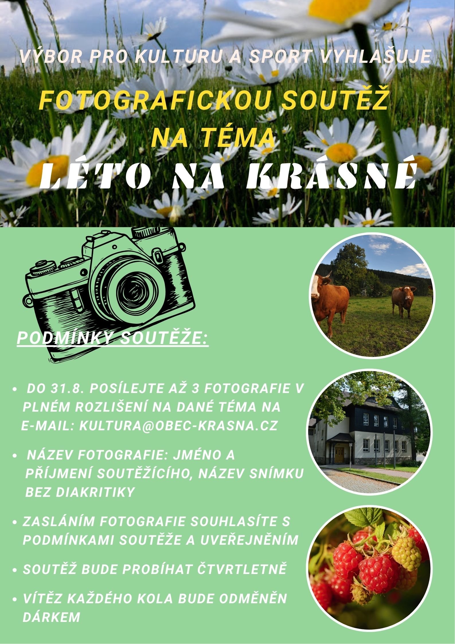 Výbor pro kulturu a sport vyhlašuje fotografickou soutěž na téma „Léto na Krásné“. Fotografie (v plném rozlišení, max. 3 ks) posílejte do 31.8.2025 na e-mail kultura@obec-krasna.cz. Vítěz bude odměněn.