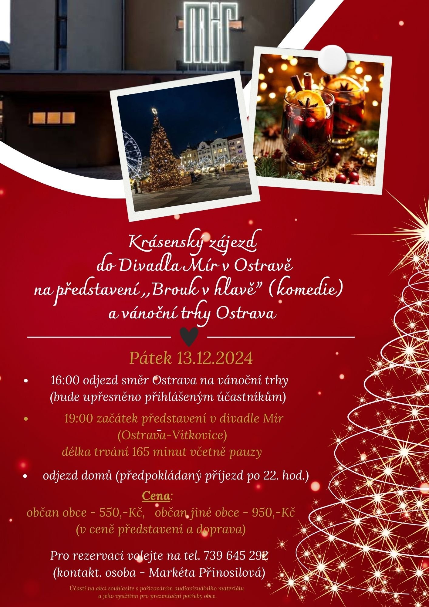uvolnilo se jedno místo na zájezd do Divadla Mír a vánoční trhy v Ostravě, konající se tento pátek 13.12. Zájemce, nechť se obrátí na tel. 739 645 292.