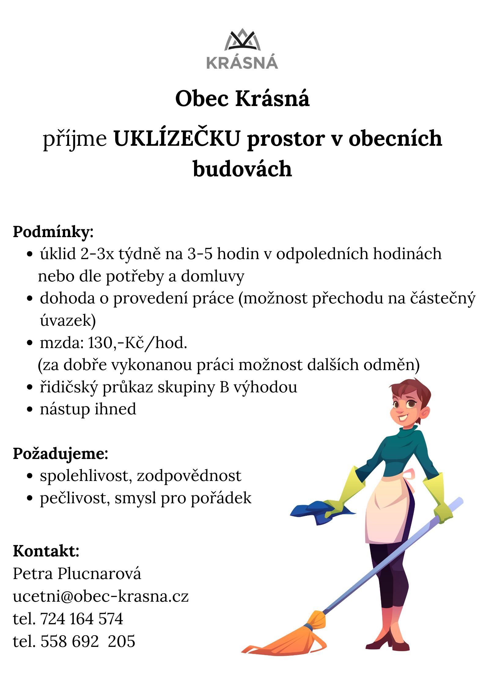 Obec Krásná přijme uklízečku prostor v obecních budovách. Nástup možný ihned!