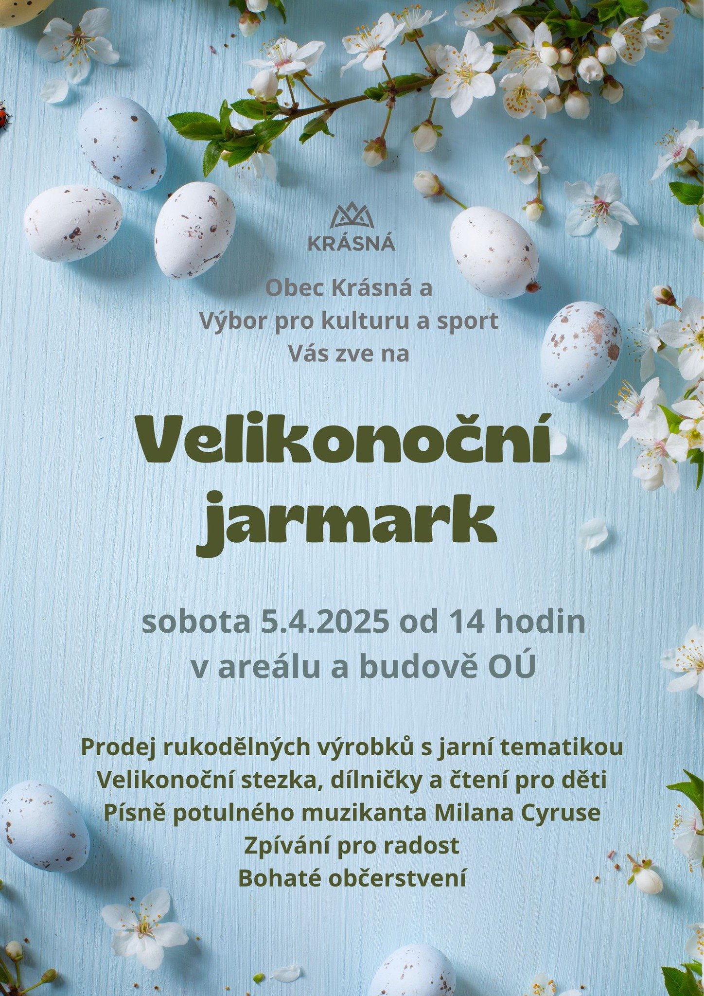 obec Krásná a Výbor pro kulturu a sport Vás srdečně zvou na Velikonoční jarmark, který se bude konat v sobotu 5.dubna 2025 od 14 hodin v areálu OÚ. Pozvánku a program celého odpoledne naleznete v příloze. Přijďte se k nám naladit na svátky jara!