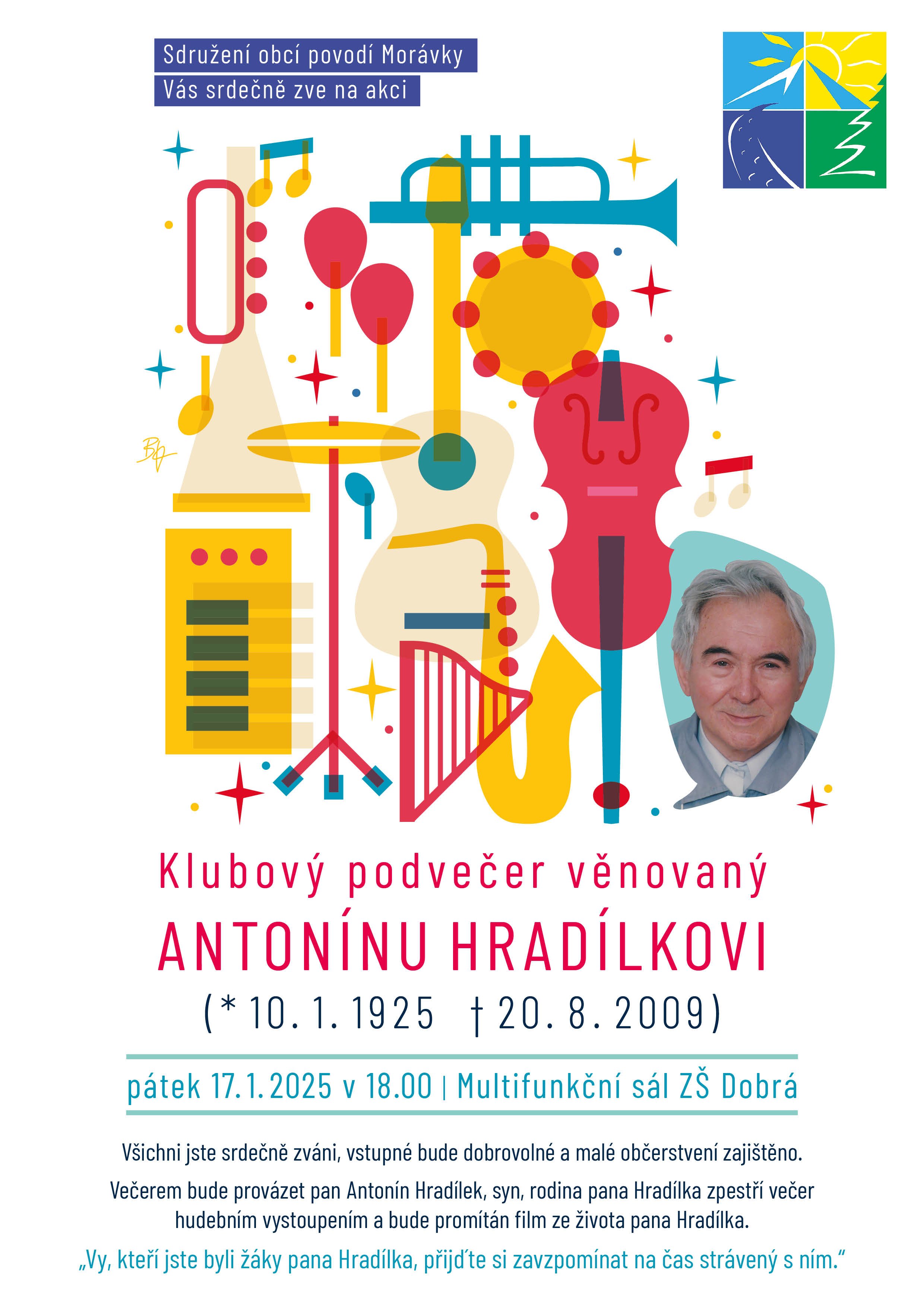 Sdružení obcí povodí Morávky Vás srdečně zve na Klubový podvečer věnovaný Antonínu Hradílkovi. Akce se koná v pátek 17.1.2025 od 18 hodin v multifunkčním sále ZŠ Dobrá.