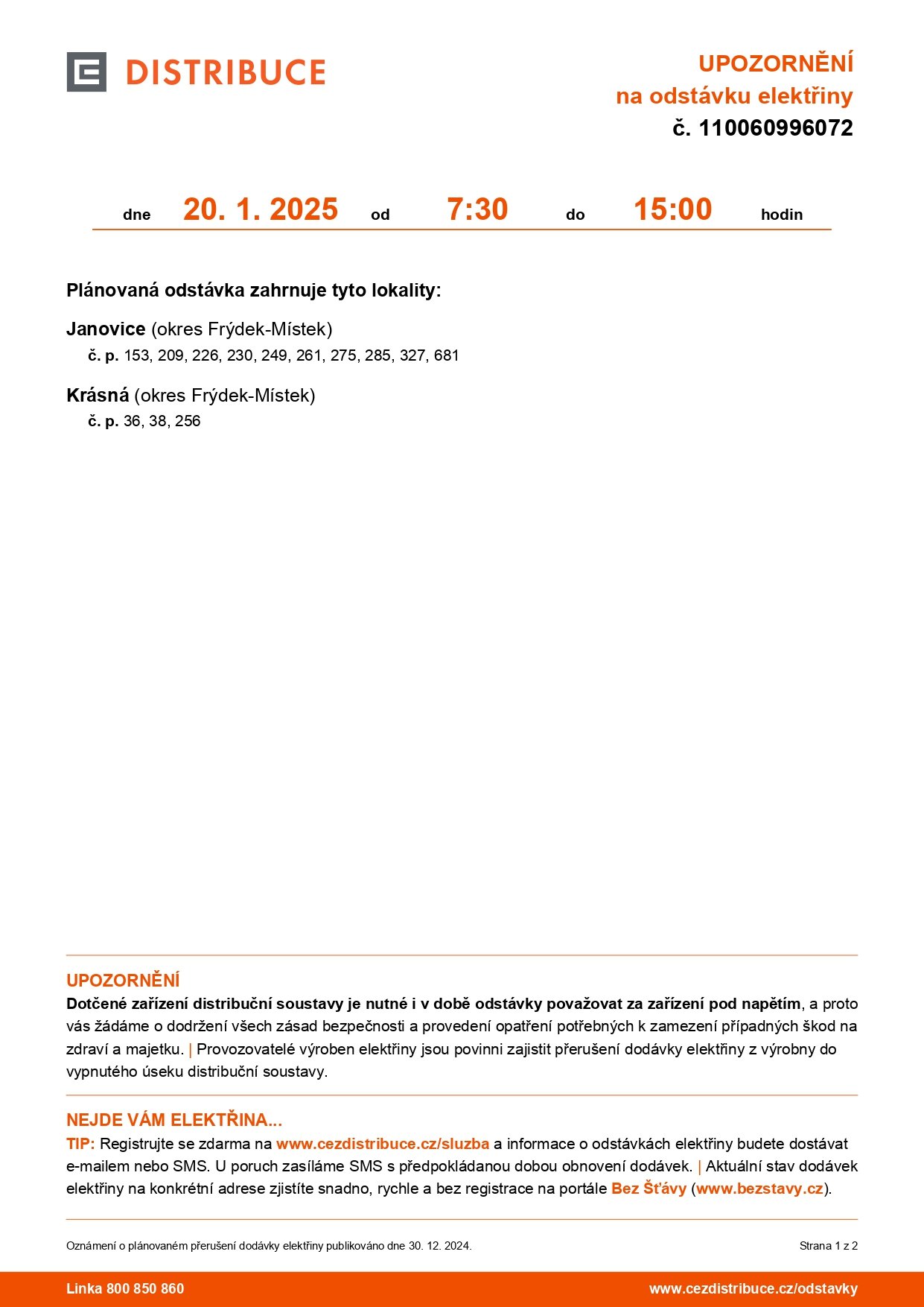 dovolujeme si Vás informovat o plánované odstávce elektřiny v části obce Krásná, a to v pondělí 20.1.2025 od 7:30 do 15:00.