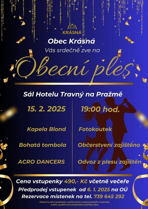 Obec Krásná Vás srdečně zve na Obecní ples, který se bude konat 15.02.2025 od 19 hodin v Hotelu Travný na Pražmě. Rezervace místenek od 6. ledna na tel. 739 645 292. Zakoupení vstupenek bude možné na OÚ v úředních hodinách rovněž od 6. ledna.