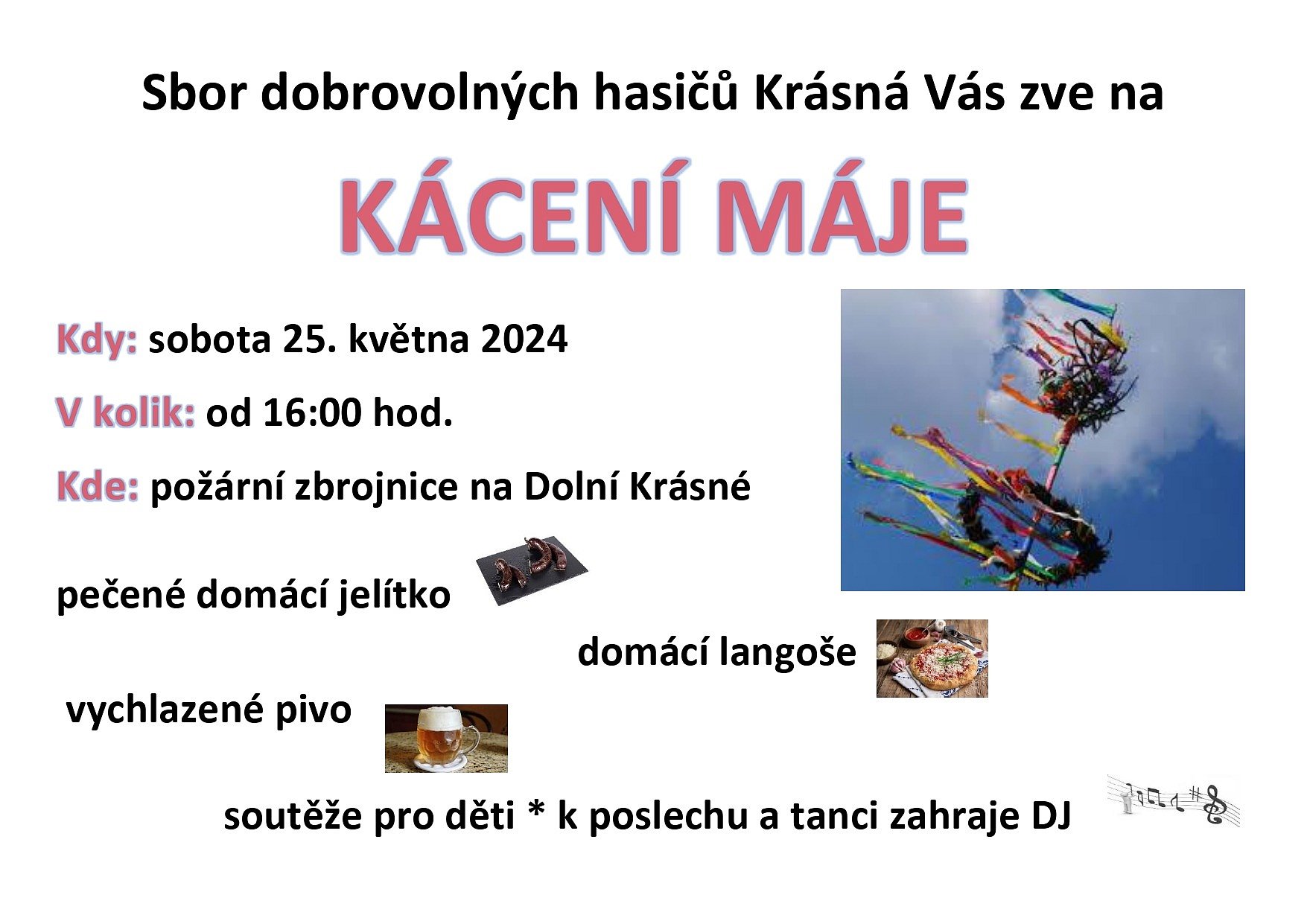 Sbor dobrovolných hasičů Krásná Vás srdečně zve na tradiční Kácení máje, které se letos uskuteční v sobotu 25.5.2024 od 16 hodin v areálu hasičské zbrojnice na Dolní Krásné.