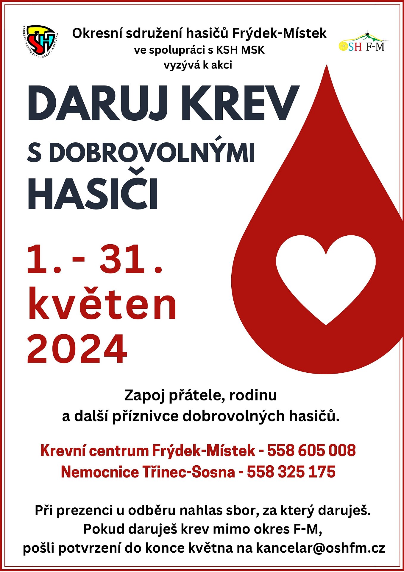 v měsíci květnu se můžete zapojit do akce Daruj krev s dobrovolnými hasiči. Krev můžete darovat v Krevním centru Frýdek-Místek nebo v Nemocnici Třinec-Sosna.