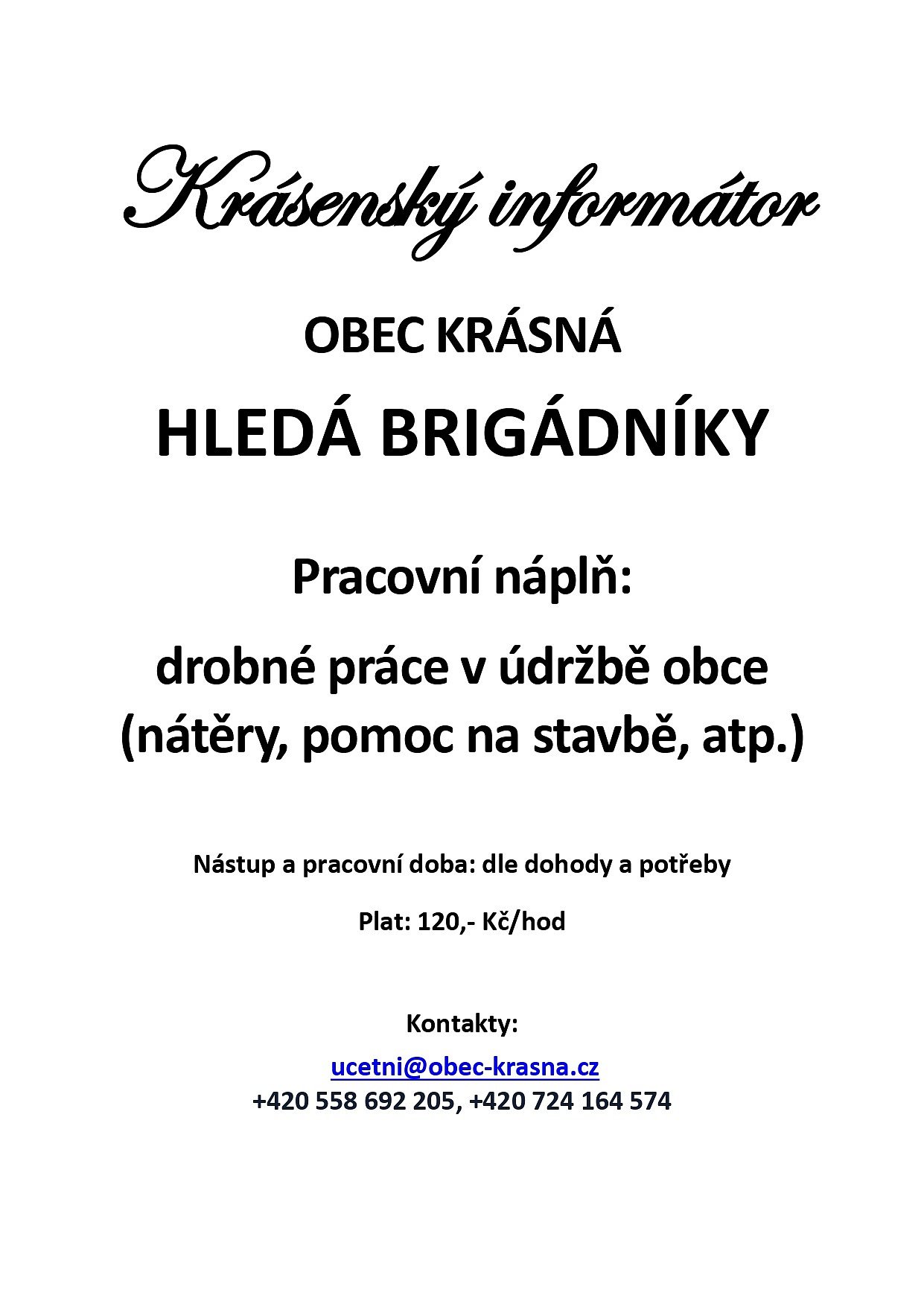 Obec Krásná hledá brigádníky na drobné práce v údržbě obce. Nástup a pracovní doba dle dohody a potřeby, plat 120Kč/hod.