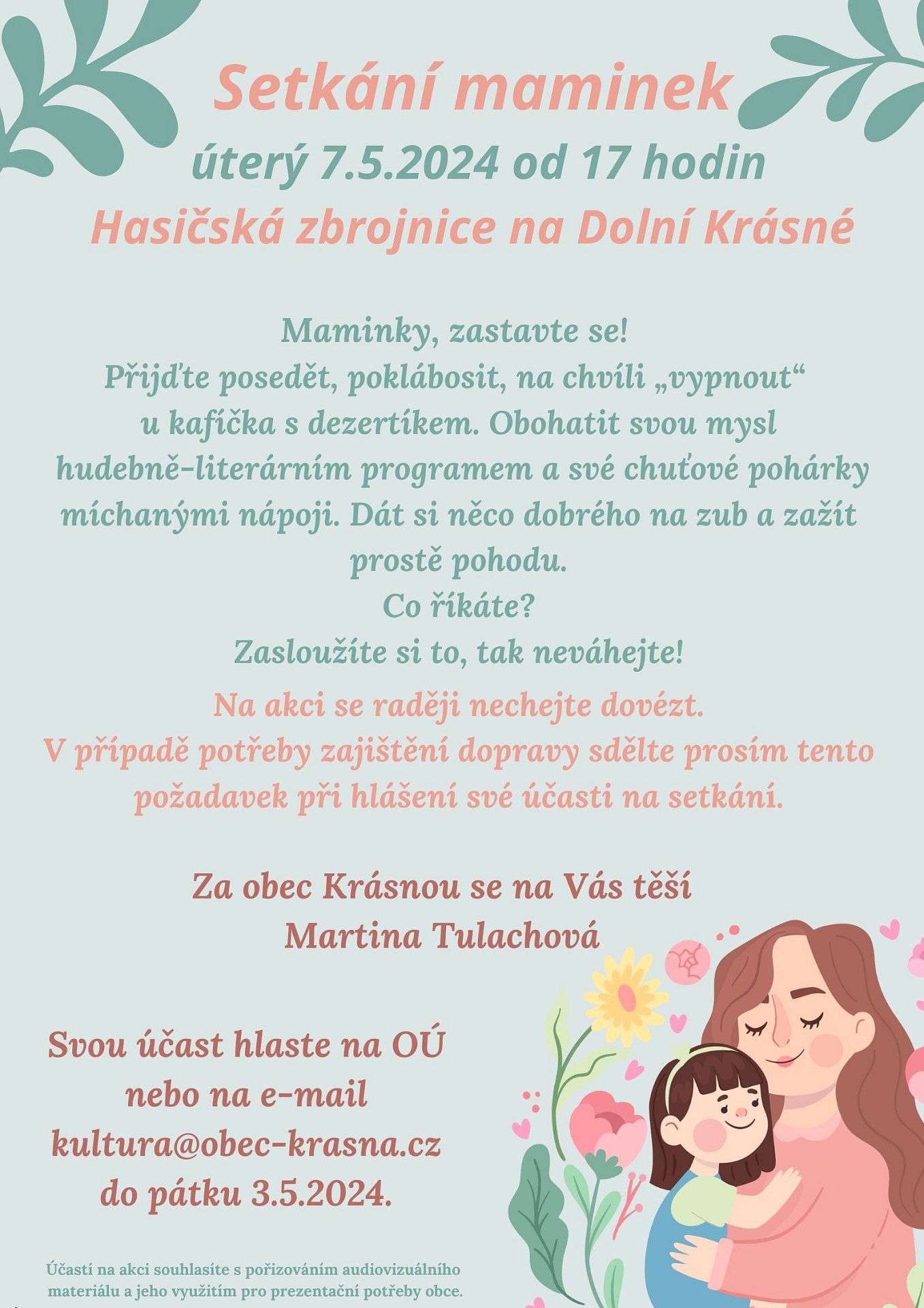 srdečně Vás zveme na Setkání maminek, které se letos uskuteční v úterý 7.5.2024 od 17 hodin v hasičské zbrojnici na Dolní Krásné. Přijďte si na chvíli odpočinout a poklábosit u kávy a dezertu. Těšit se můžete také na hudebně-literární program.