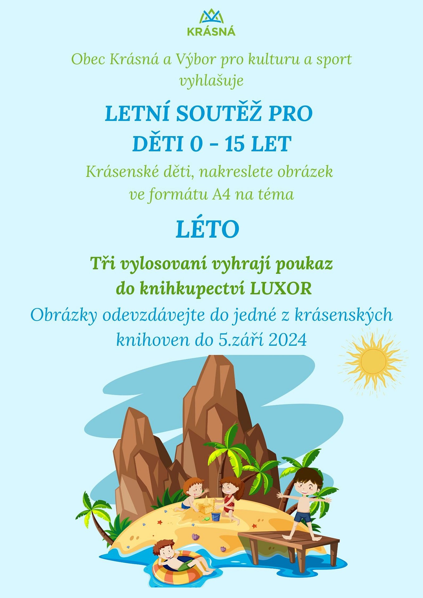 máme pro vás další kolo soutěžě, tentokrát na téma „Léto“. Nakreslete obrázek s letní tematikou a přineste jej do 5.9.2024 do jedné z krásenských knihoven. Vyherci získají poukazku do knihkupectví LUXOR.