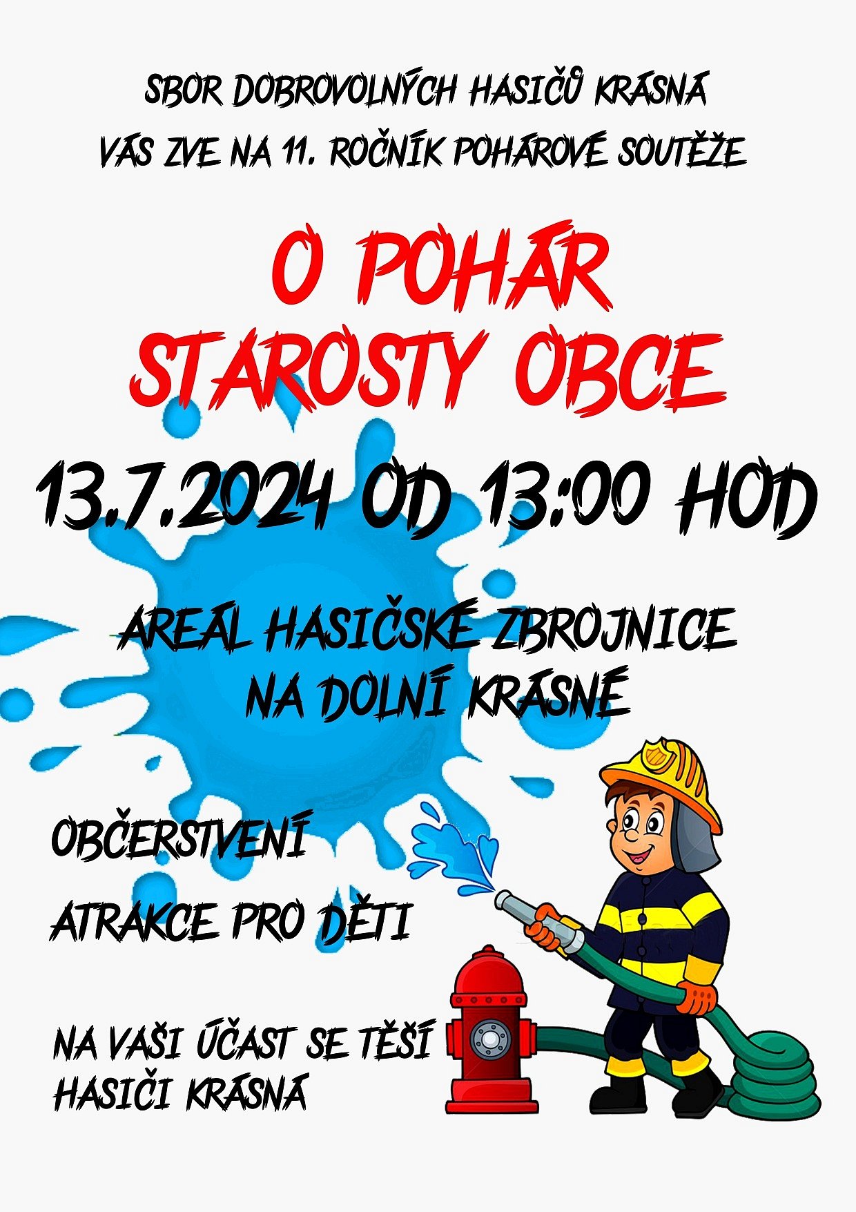 Sbor dobrovolných hasičů Krásná Vás zve na 11. ročník pohárové soutěže O pohár starosty obce. Akce se koná v sobotu 13.07.2024 od 13 hodin v areálu hasičské zbrojnice na Dolní Krásné.