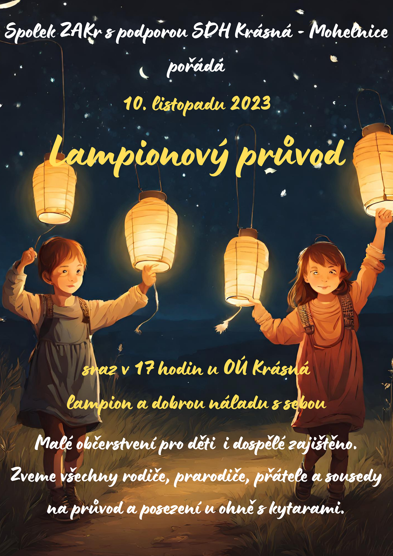 srdečně Vás zveme na Lampionový průvod, který se bude konat 10.11.2023. Startujeme v 17 hodin od Obecního úřadu Krásná. Lampiony a dobrou náladu s sebou, občerstvení zajištěno.