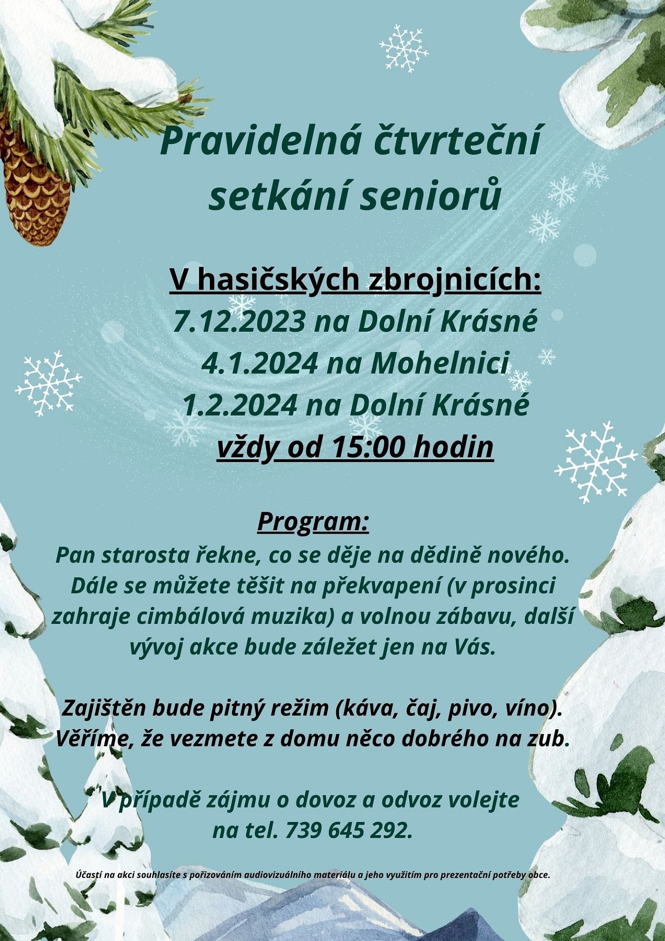 i v zimě pokračují pravidelná setkávání seniorů – vždy první čtvrtek v měsící. Z důvodu rekonstrukce sálu na obecním úřadu se akce bude pořádat v hasičských zbrojnicích na Mohelnici a Dolní Krásné.